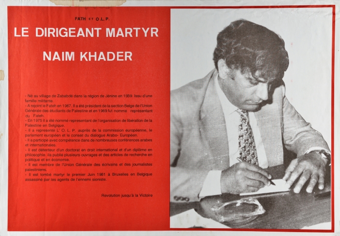 ملصق بعنوان "القائد الشهيد نعيم خضر" صادرعن منظمة التحرير الفلسطيينية، ويتضمن صورة للشهيد نعيم خضر وسيرة ذاتية مختصرة عنه باللغة الفرنسية.