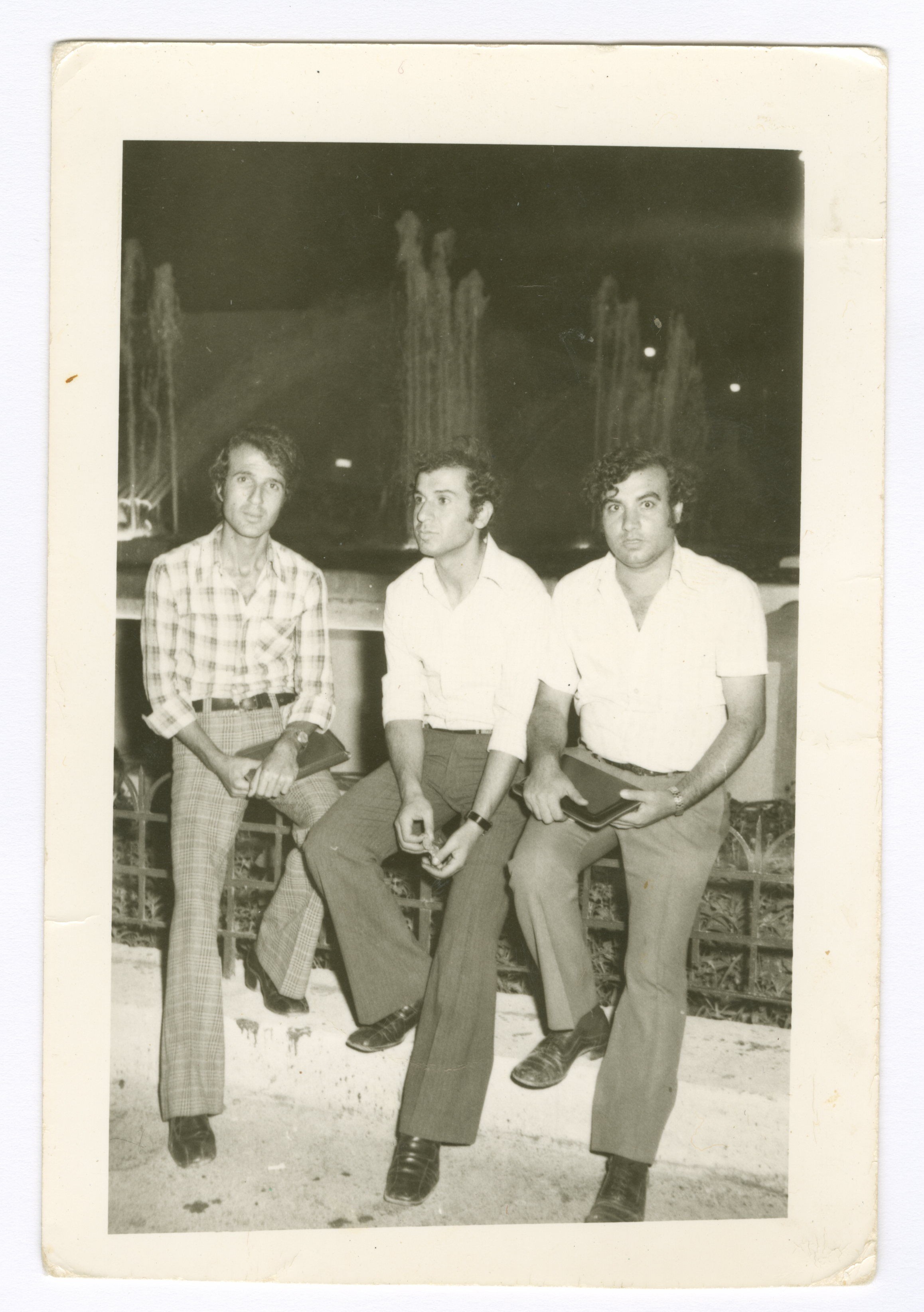 طلبة فلسطينيون في معرض دمشق الدولي خلال فترة دراستهم في سوريا.(من اليمين): محمد سامي عرار، غسان، محمد ابو الهيجا)