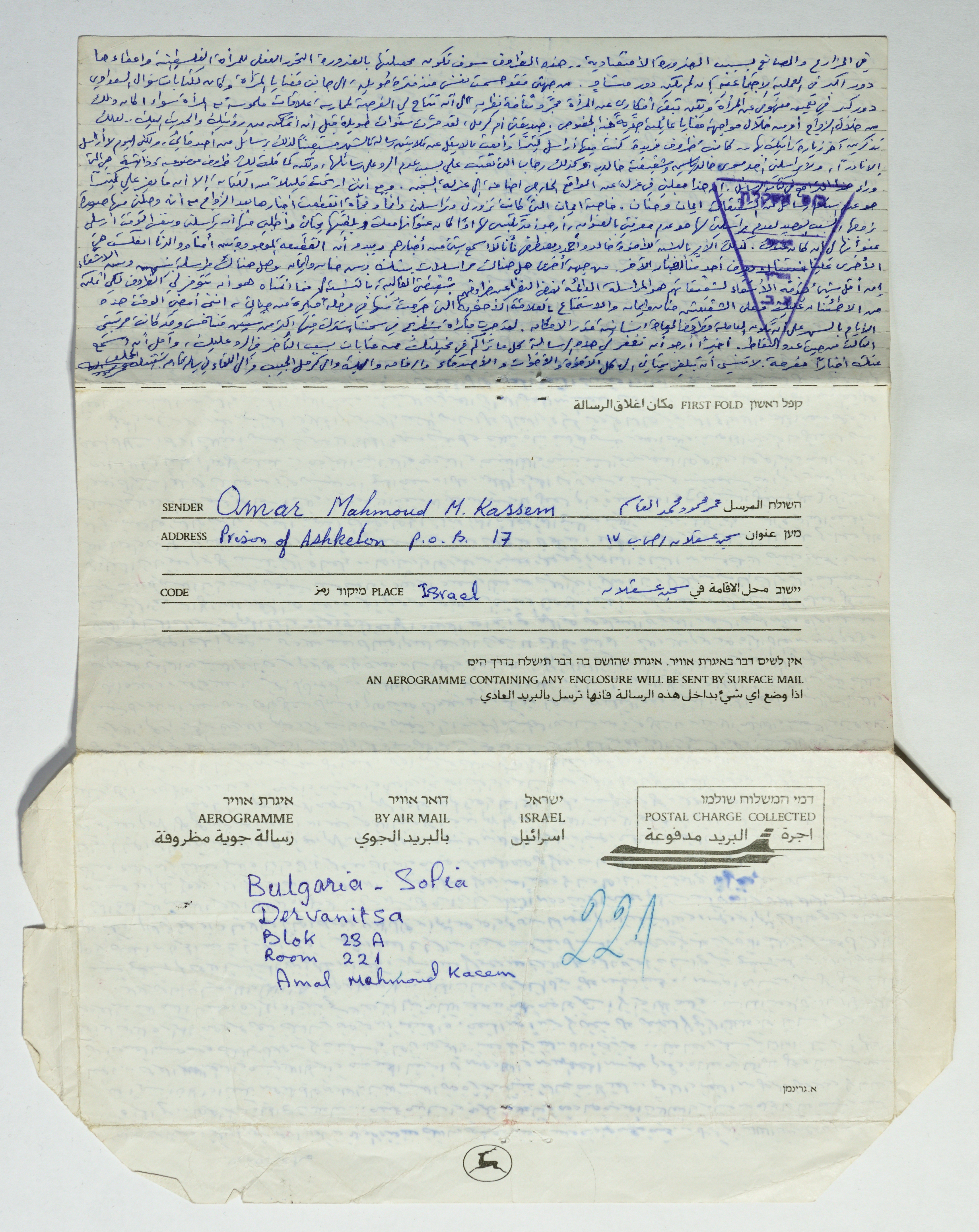 رسالة مؤرخة في 15 كانون الأول 1987، أرسلها عمر القاسم في سجن عسقلان إلى شقيقته آمال القاسم في صوفيا.
