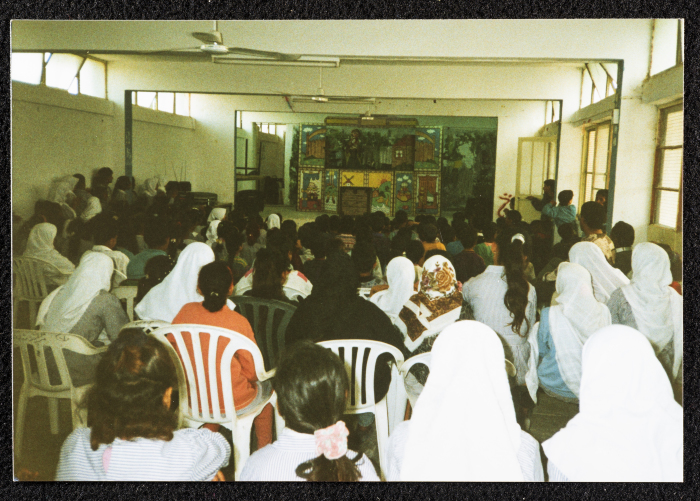 A photograph of al-Kasaba Theatre and Cinematheque's "The Golden Fish" puppet show in 1996. Adapted by al-Kasaba and directed by George Ibrahim, the play featured a cast of Palestinian actors, including Husam abu-ʿEisha and Georgina Aṣfur.