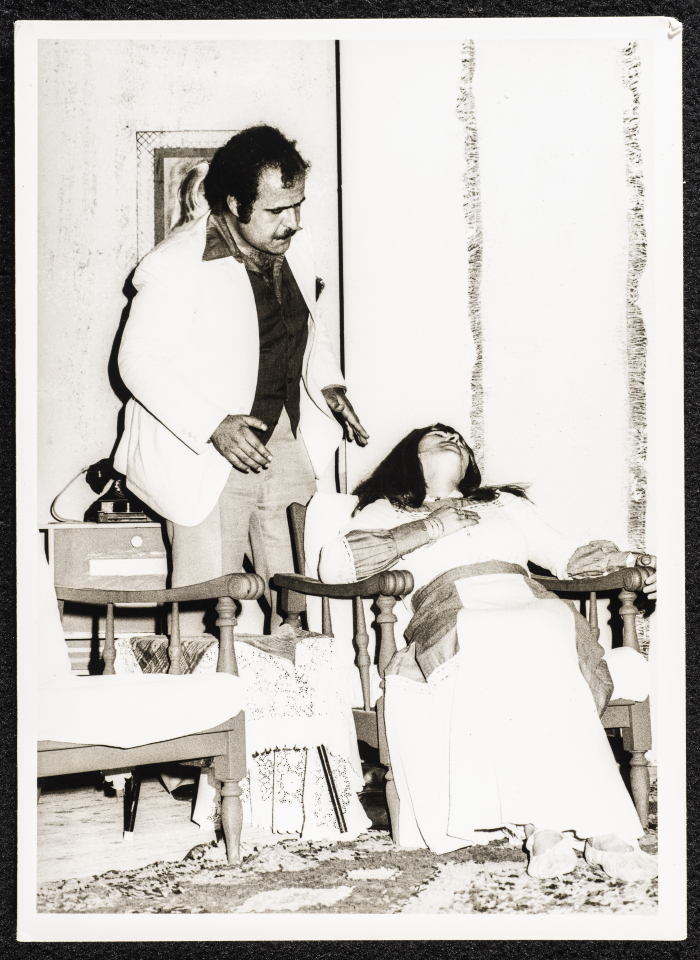 Taken in 1977 at al-Kasaba Theatre and Cinematheque, this black-and-white photograph captures a freeze of George Ibrahim's adaptation of Pierre de Beaumarchais's play, "Who Mocks Who?". Directed by Ibrahim, the performance featured a cast of Palestinian actors, including George Ibrahim, Jackie Ayyoub, Bassam Zuʿmut, Mahmoud ʿawad, Jawad Risheq, and Jamal Isʿayed.