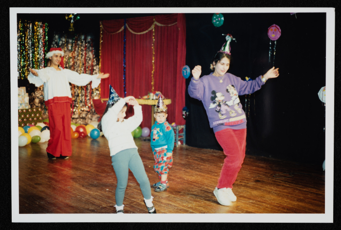 Taken between 1994-1995, this colour photograph shows "Awqat al-farah" [Time for Joy]- entertaining children show produced by al-Kasaba Theatre and Cinematheque. The show featured several dance, singing, and magic performances as well as entertaining competitions for children. The show used to be performed at Christmastime, featuring a cast of performers, including Fady el-Ghul, Husam abu ʿaysha, Niriman Manṣur, and Khalid al-Maṣu.