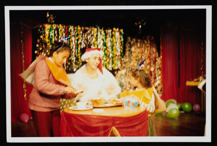 Taken between 1994-1995, this colour photograph shows "Awqat al-farah" [Time for Joy]- entertaining children show produced by al-Kasaba Theatre and Cinematheque. The show featured several dance, singing, and magic performances as well as entertaining competitions for children. The show used to be performed at Christmastime, featuring a cast of performers, including Fady el-Ghul, Husam abu ʿaysha, Niriman Manṣur, and Khalid al-Maṣu.