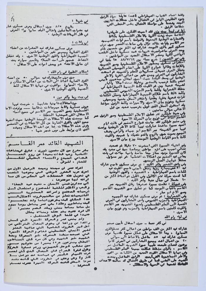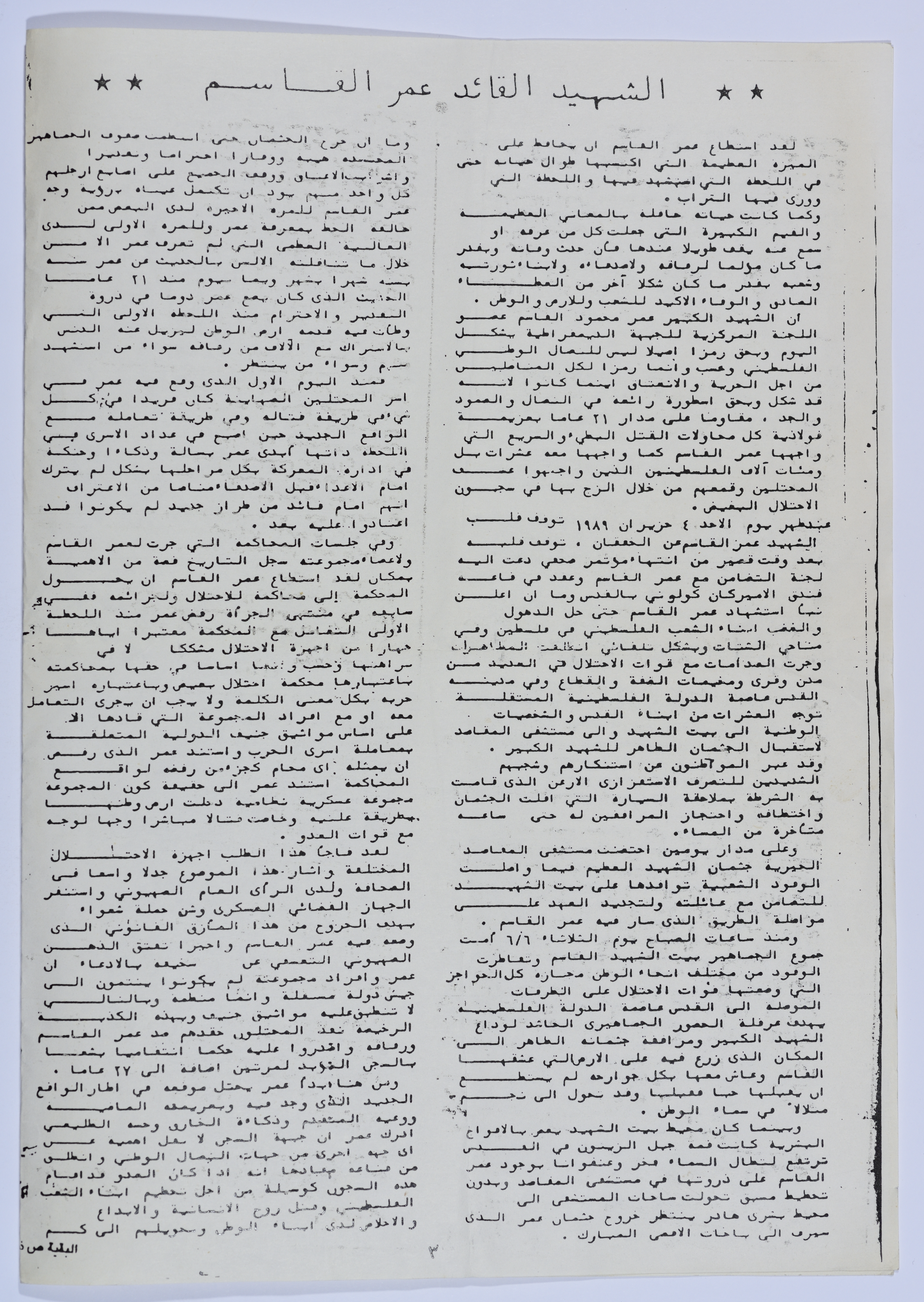 صفحة من جريدة تتضمن مقالًا صحفيًا يتحدث عن سيرة الشهيد ومراحل اعتقاله وخلفيات استشهاده وحالته المرضية، وذلك في 1989.