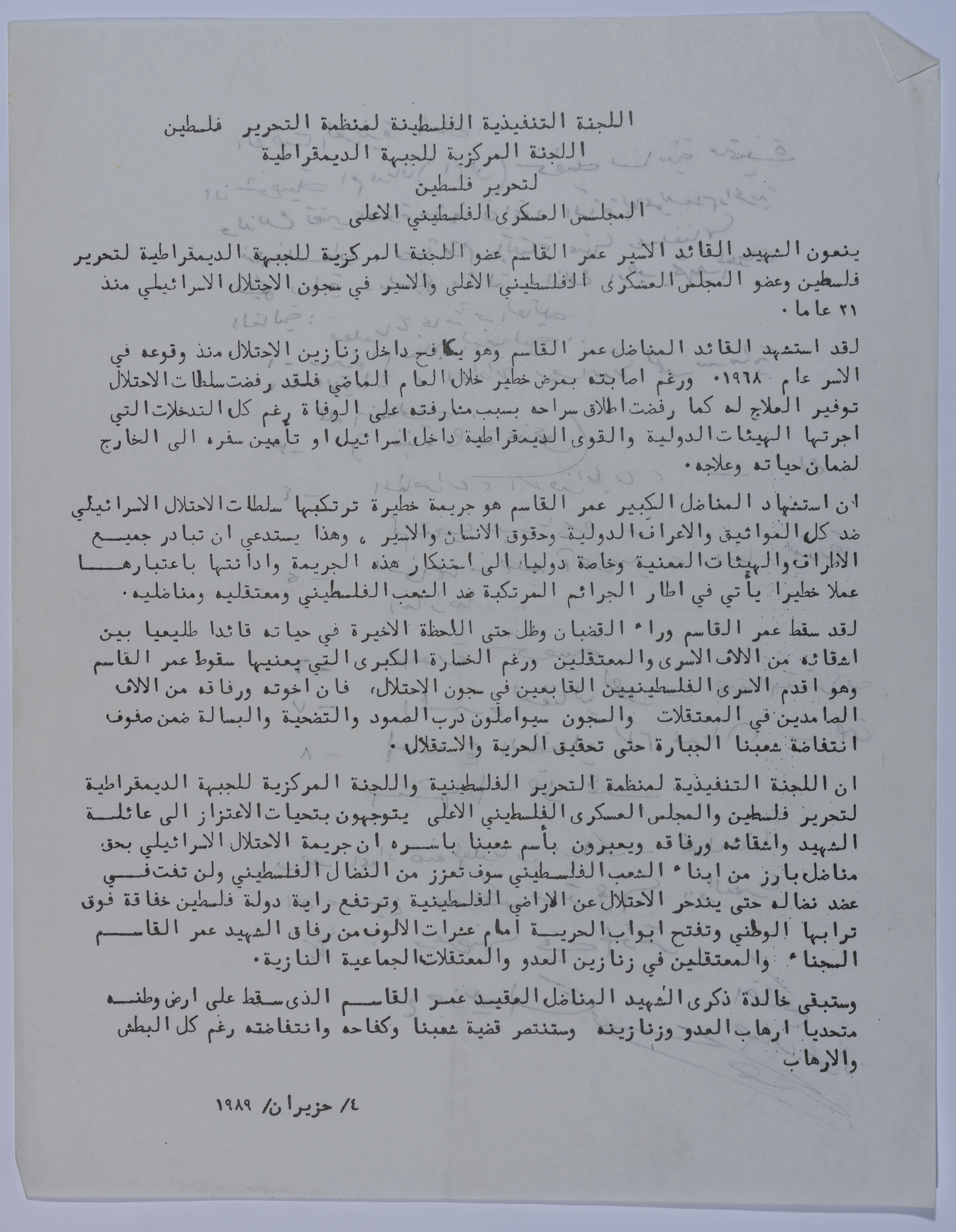 بيان صدر بتاريخ 4 حزيران 1989، عن اللجنة التنفيذية لمنظمة التحرير الفلسطينية والجبهة الديمقراطية لتحرير فلسطين، والمجلس العسكري الفلسطيني الأعلى، ينعون فيه الشهيد عمر القاسم.