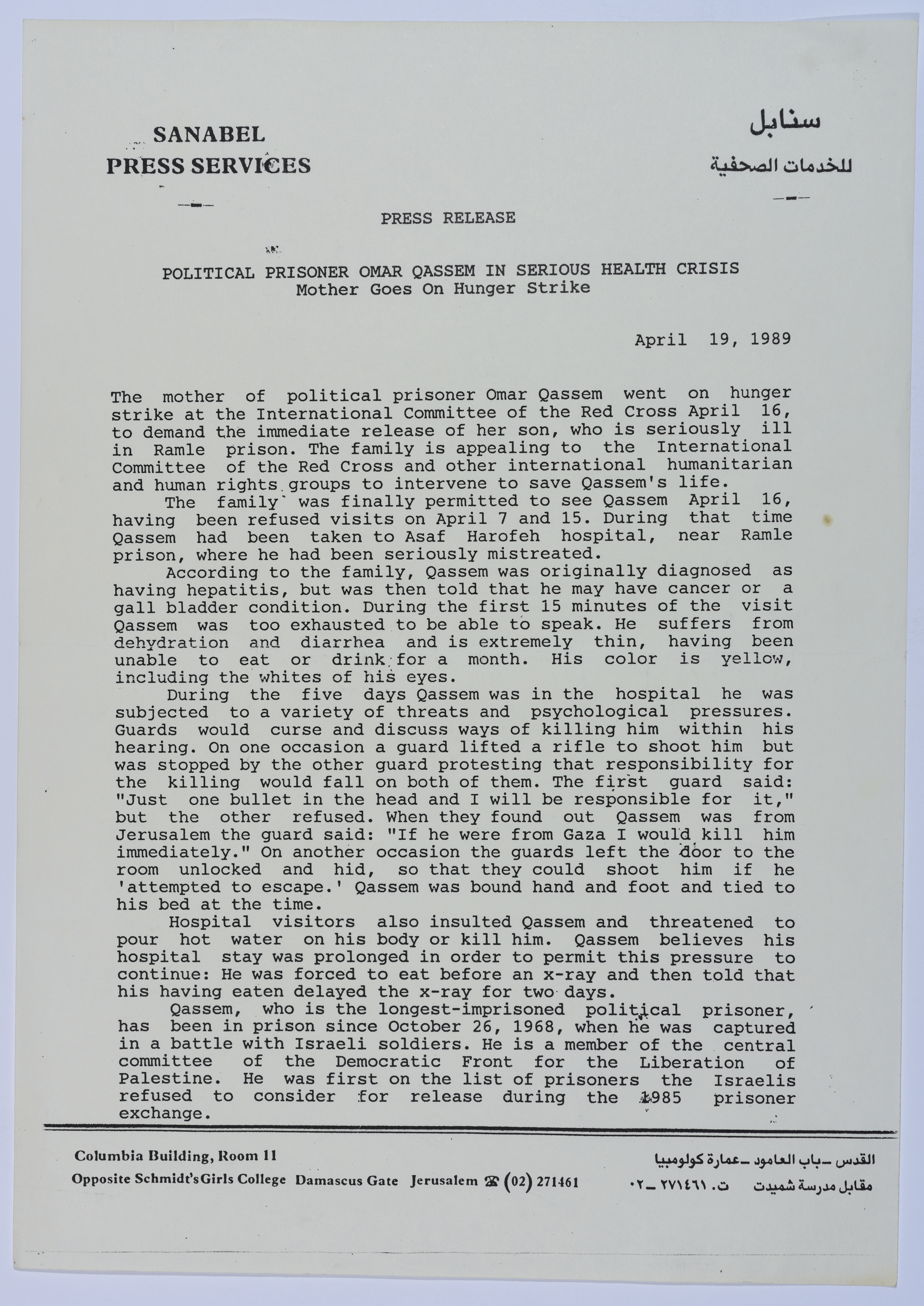 Issued by the Daily Sanabel Pamphlet in English on 19 April 1989, this document shows news about the negative development of prisoner Omar al-Qasim's health and his mother's strike at the International Committee of the Red Cross in Jerusalem.