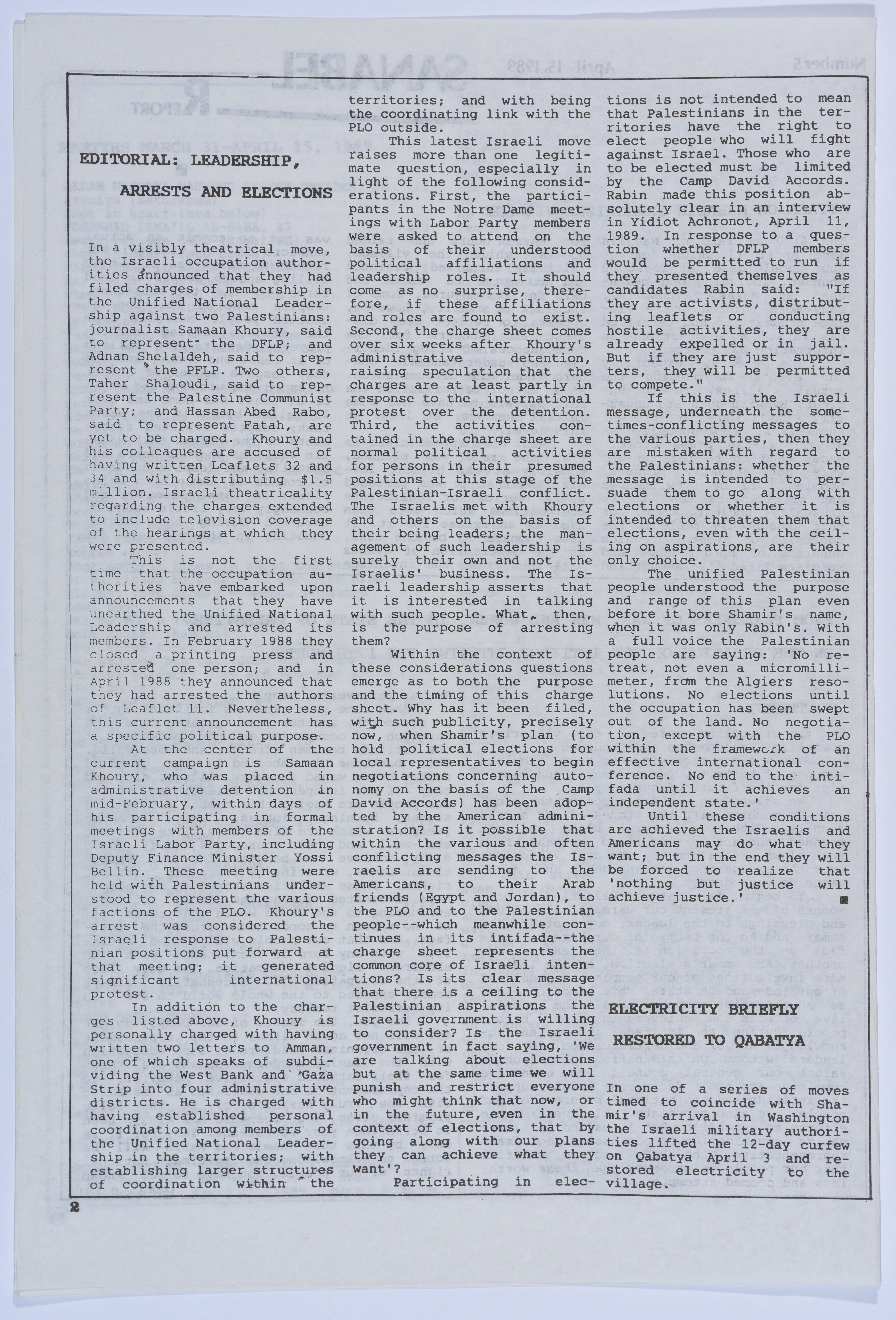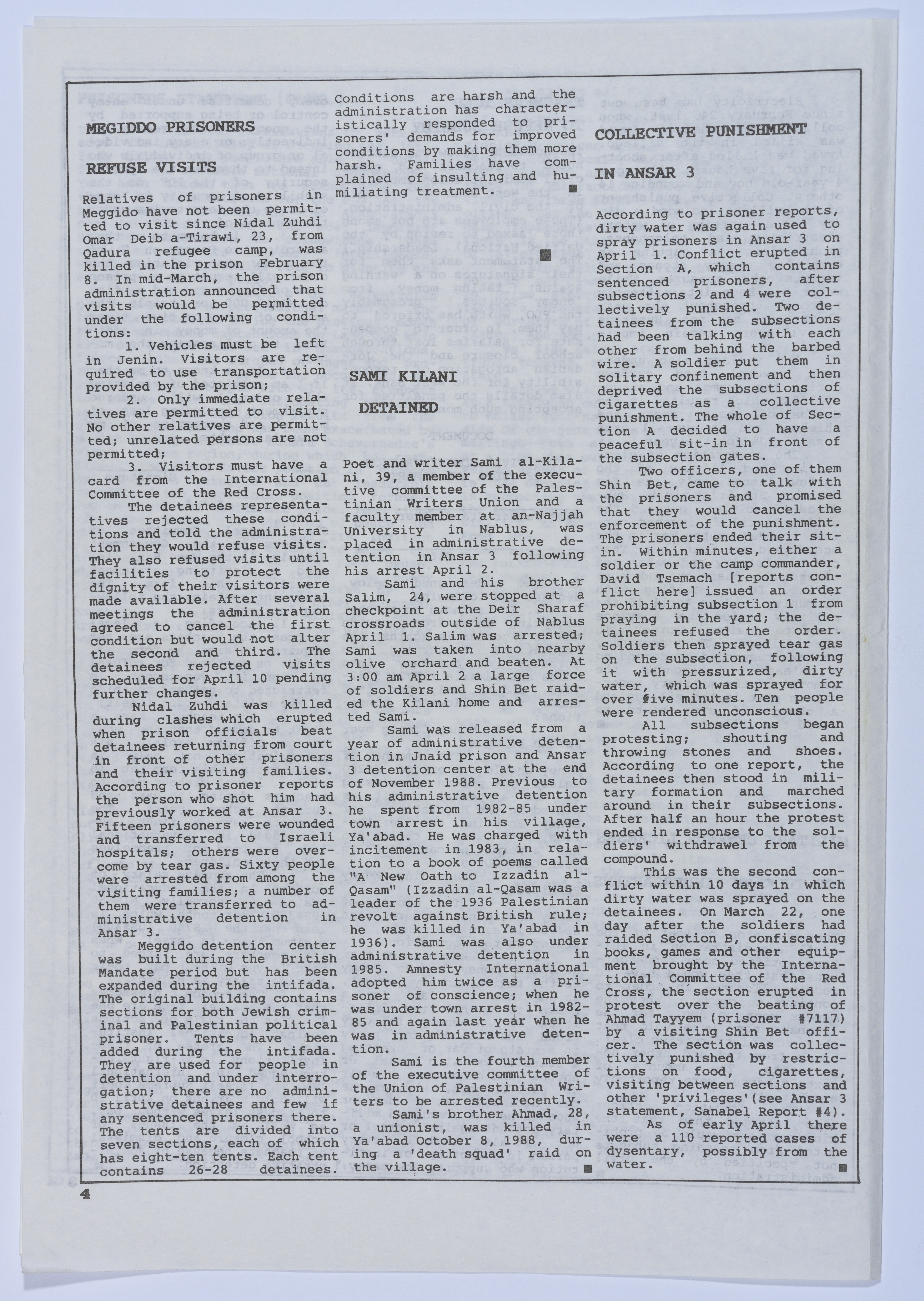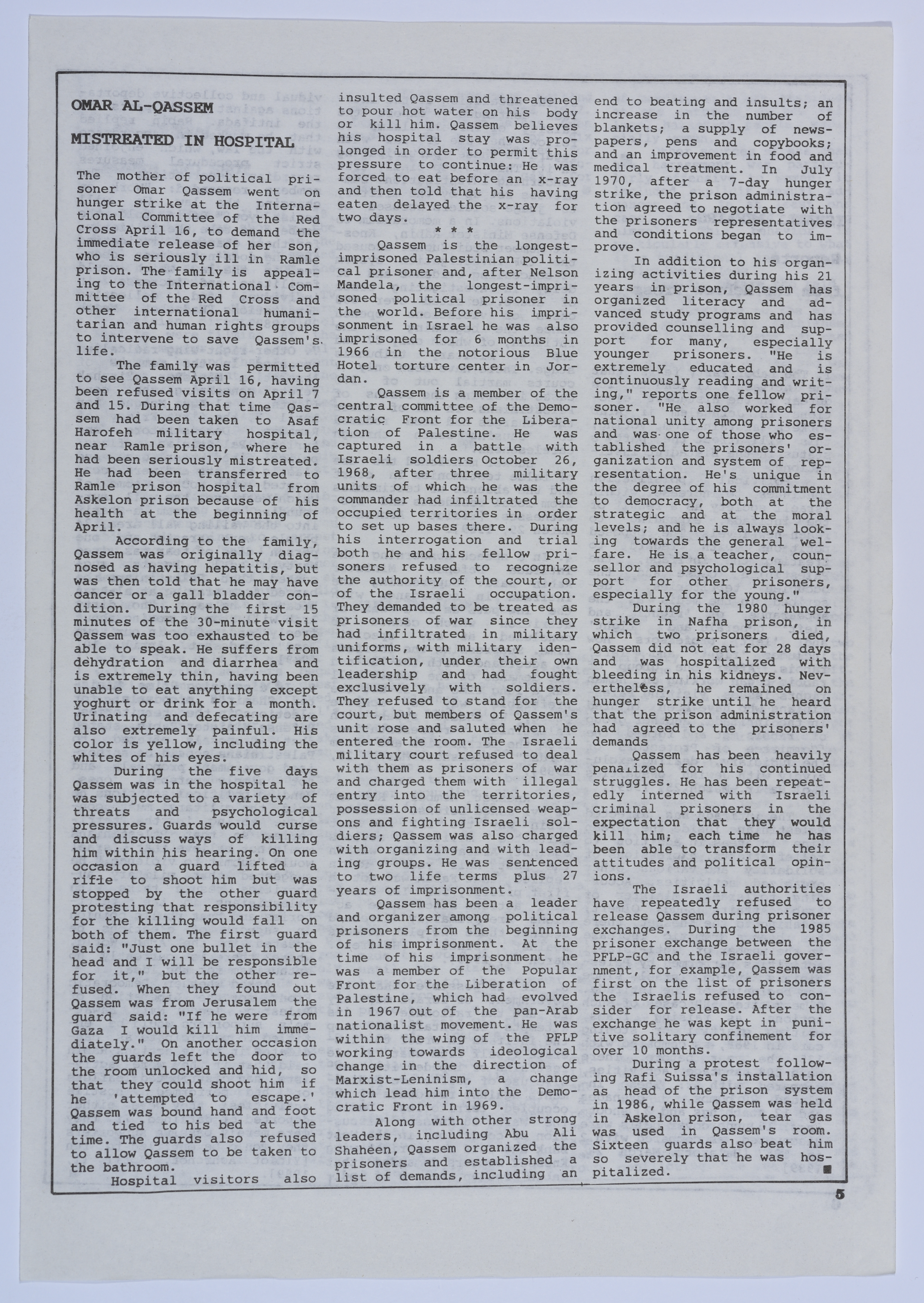 أخبار صحفية تتحدث عن المعاملة السيئة التي تلقاها الأسير عمر القاسم أثناء تواجده في المستشفى، بالإضافة إلى الإضراب عن الطعام الذي خاضته والدته في مكتب الصليب الأحمر الدولي، هذا وتتحدث أيضًا عن الفعاليات التي نظمتها عائلة القاسم للضغط على المؤسسات الدولية ومؤسسات حقوق الإنسان من أجل إنقاذه، نشرتها نشرة سنابل اليومية باللغة الإنجليزية بتاريخ 15 نيسان 1989.
