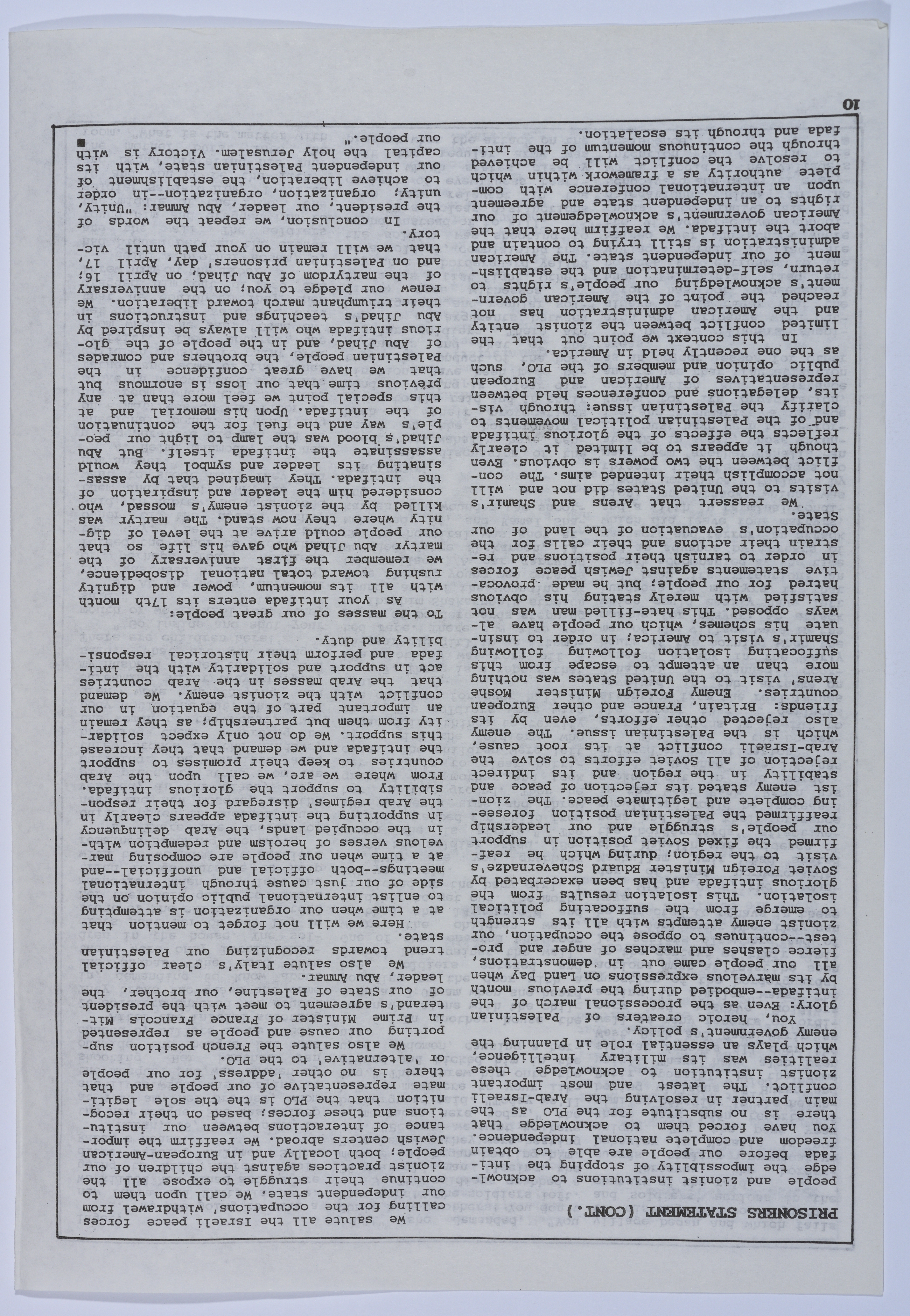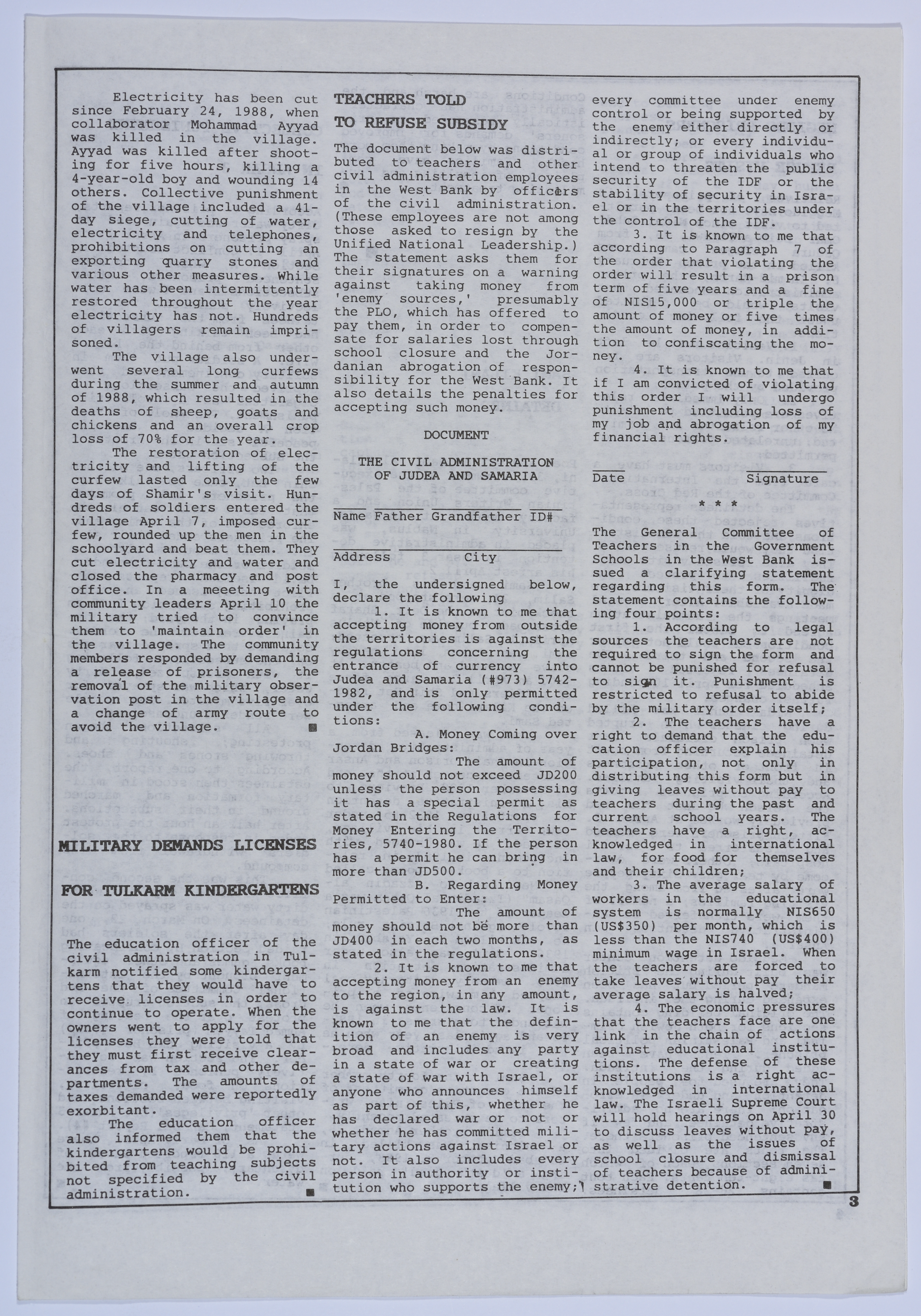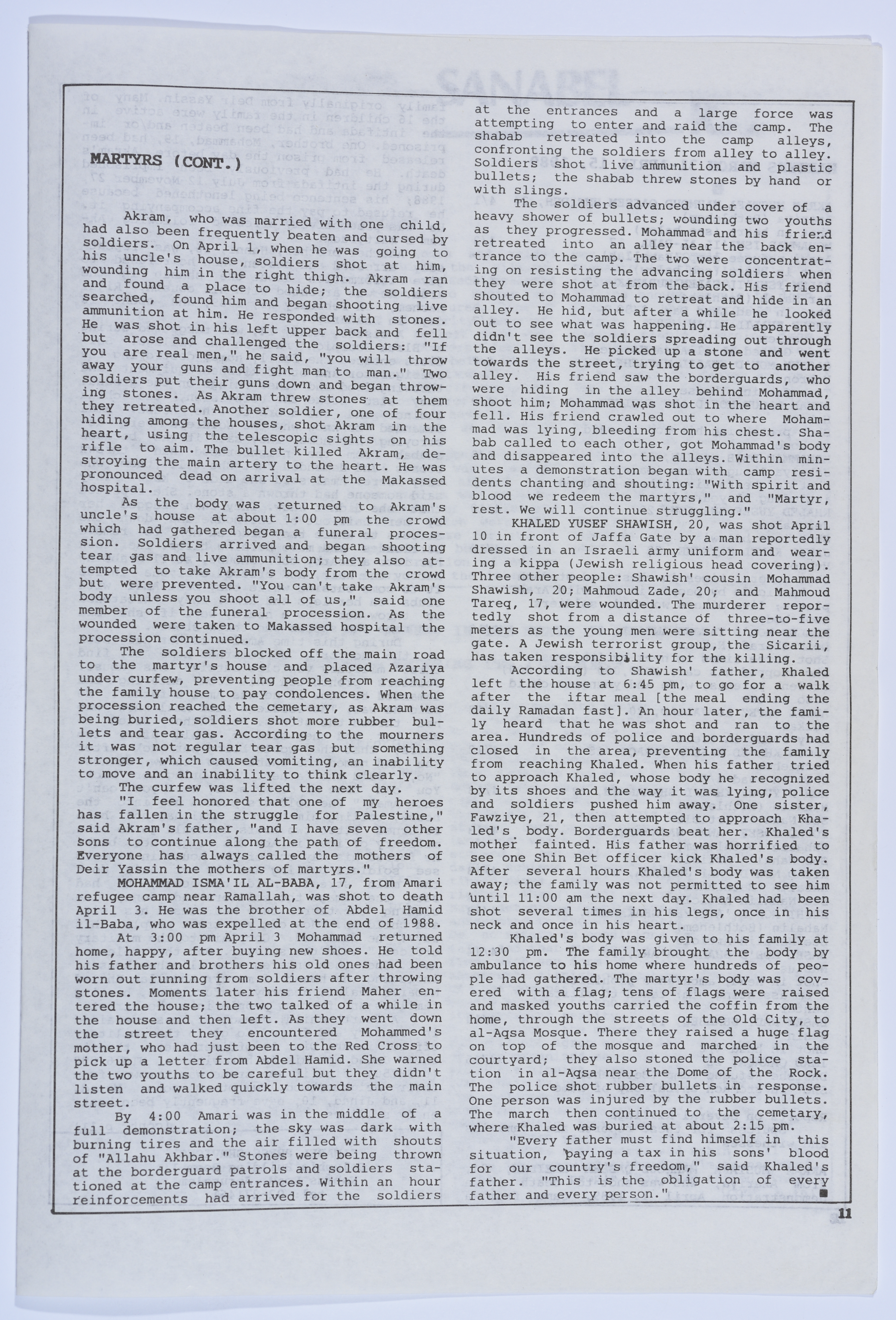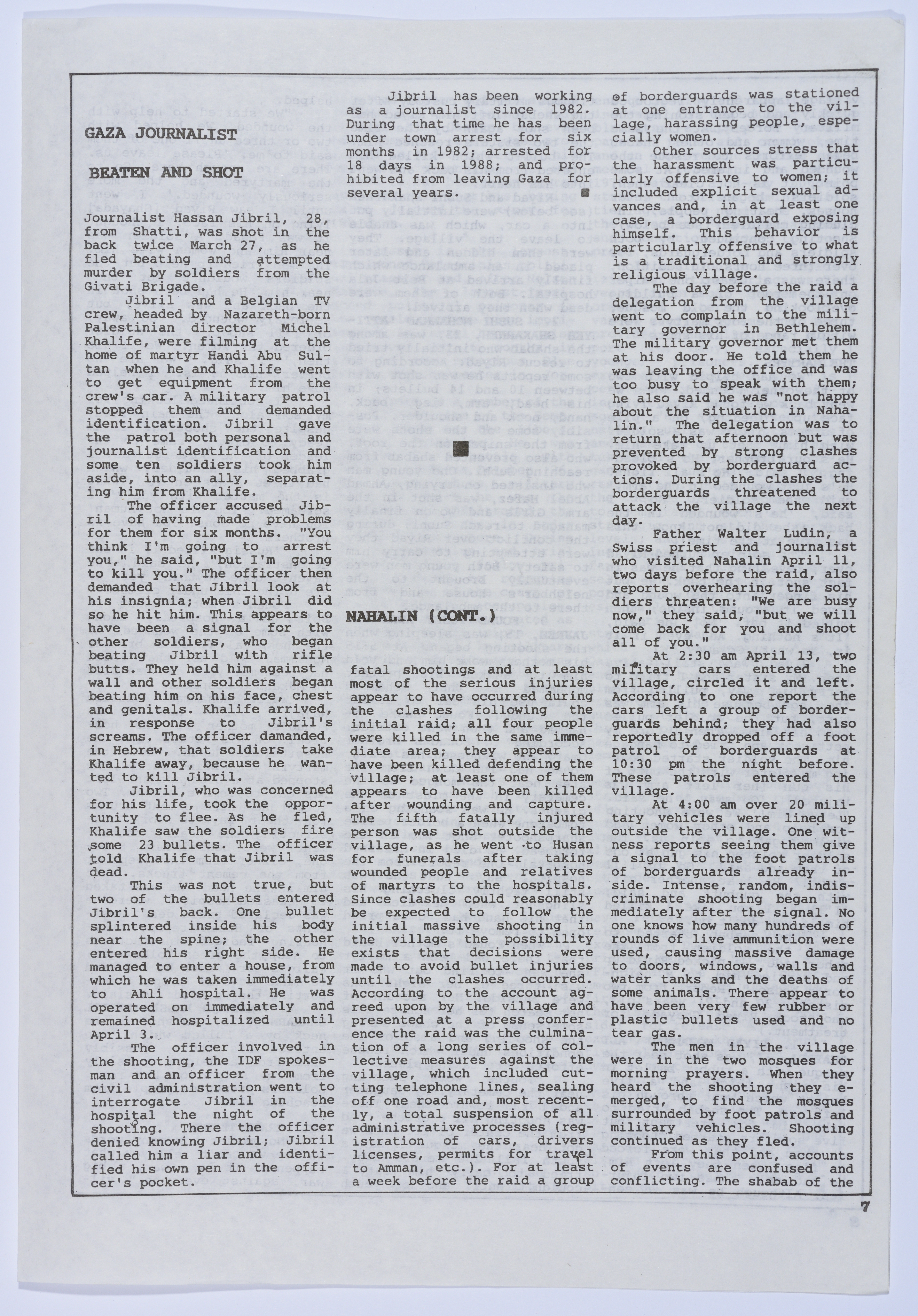 أخبار صحفية تتحدث عن المعاملة السيئة التي تلقاها الأسير عمر القاسم أثناء تواجده في المستشفى، بالإضافة إلى الإضراب عن الطعام الذي خاضته والدته في مكتب الصليب الأحمر الدولي، هذا وتتحدث أيضًا عن الفعاليات التي نظمتها عائلة القاسم للضغط على المؤسسات الدولية ومؤسسات حقوق الإنسان من أجل إنقاذه، نشرتها نشرة سنابل اليومية باللغة الإنجليزية بتاريخ 15 نيسان 1989.