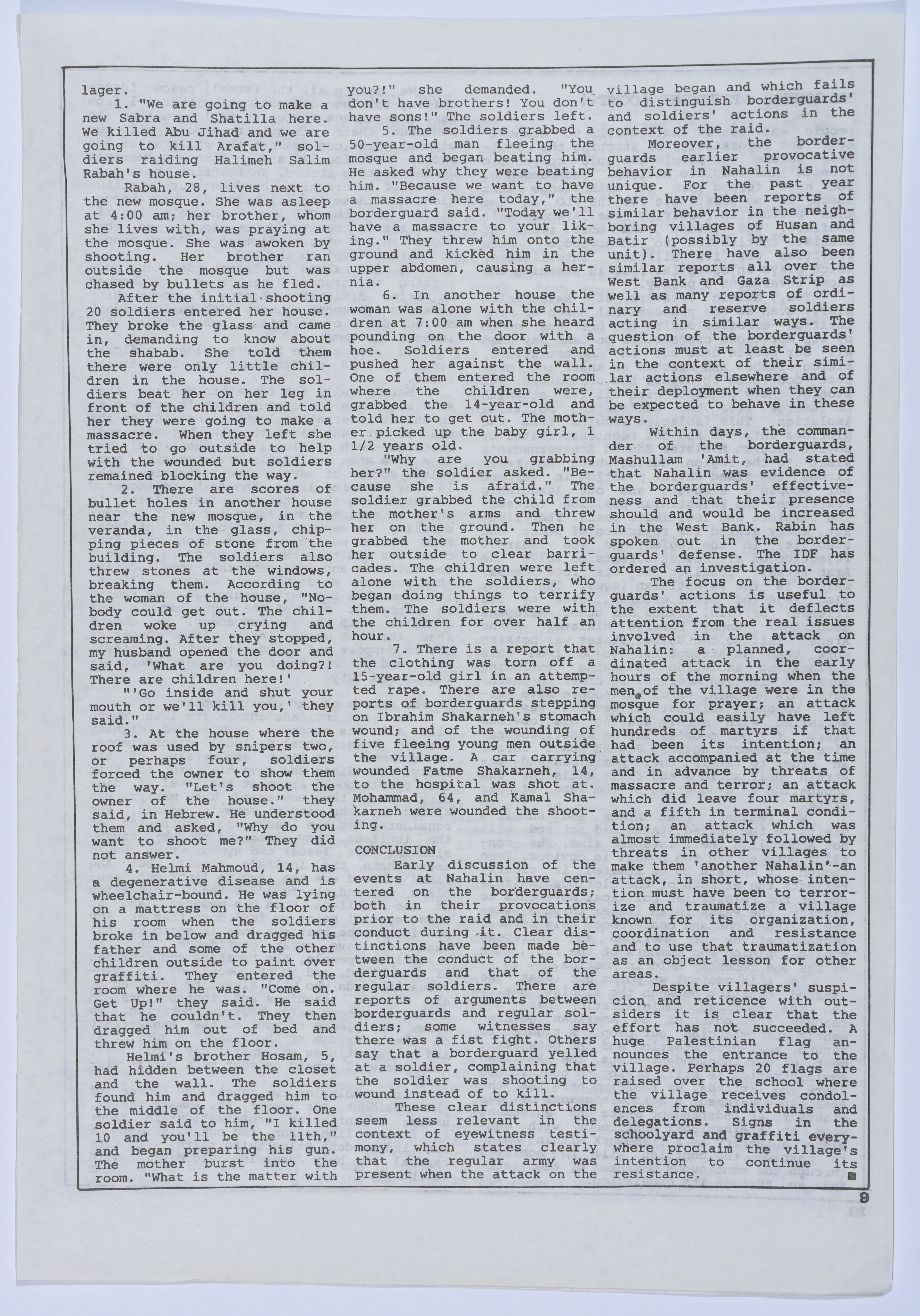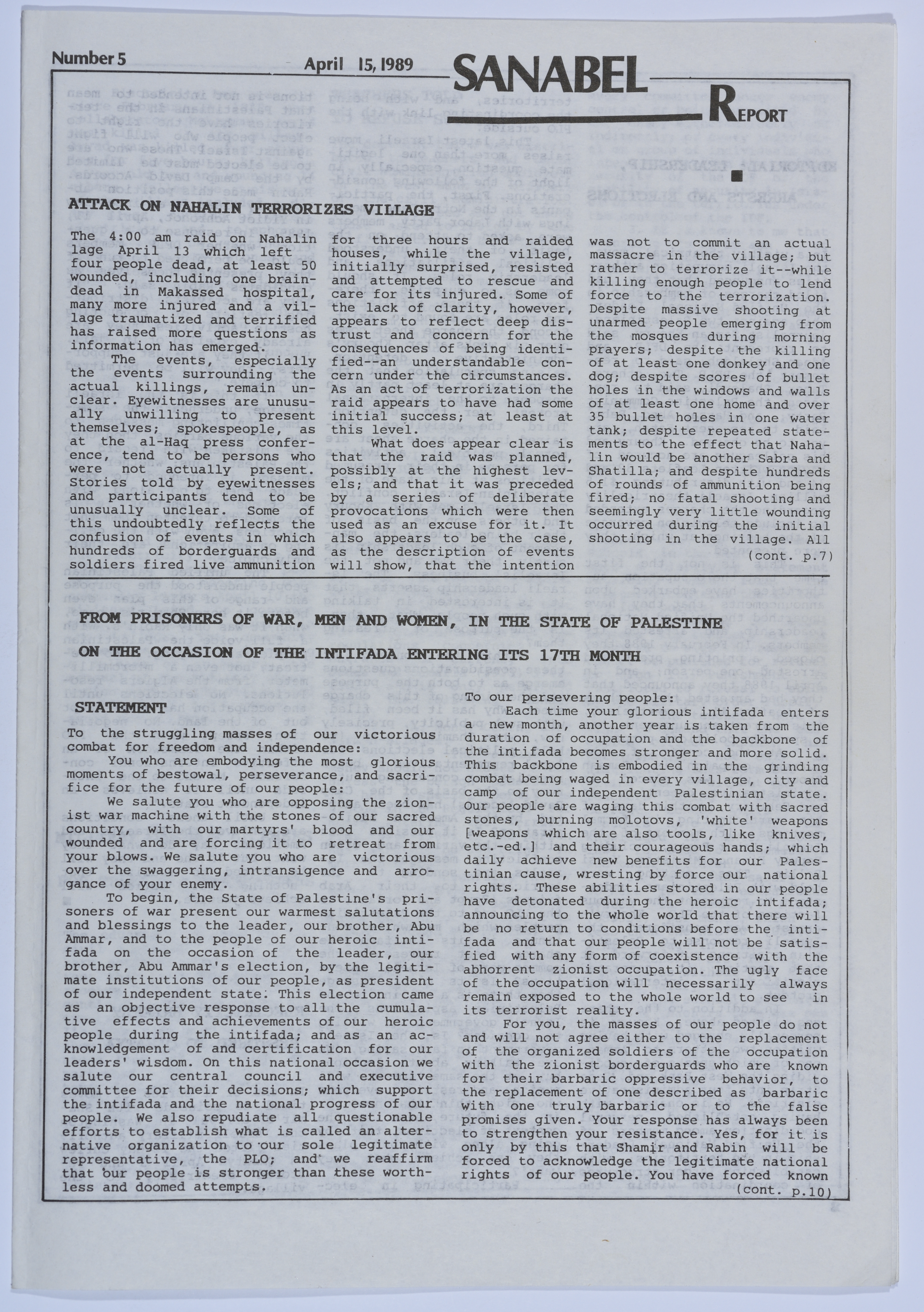 عمر القاسم يلقى معاملة سيئة في المستشفى، نشرة سنابل، 15 نيسان 1989