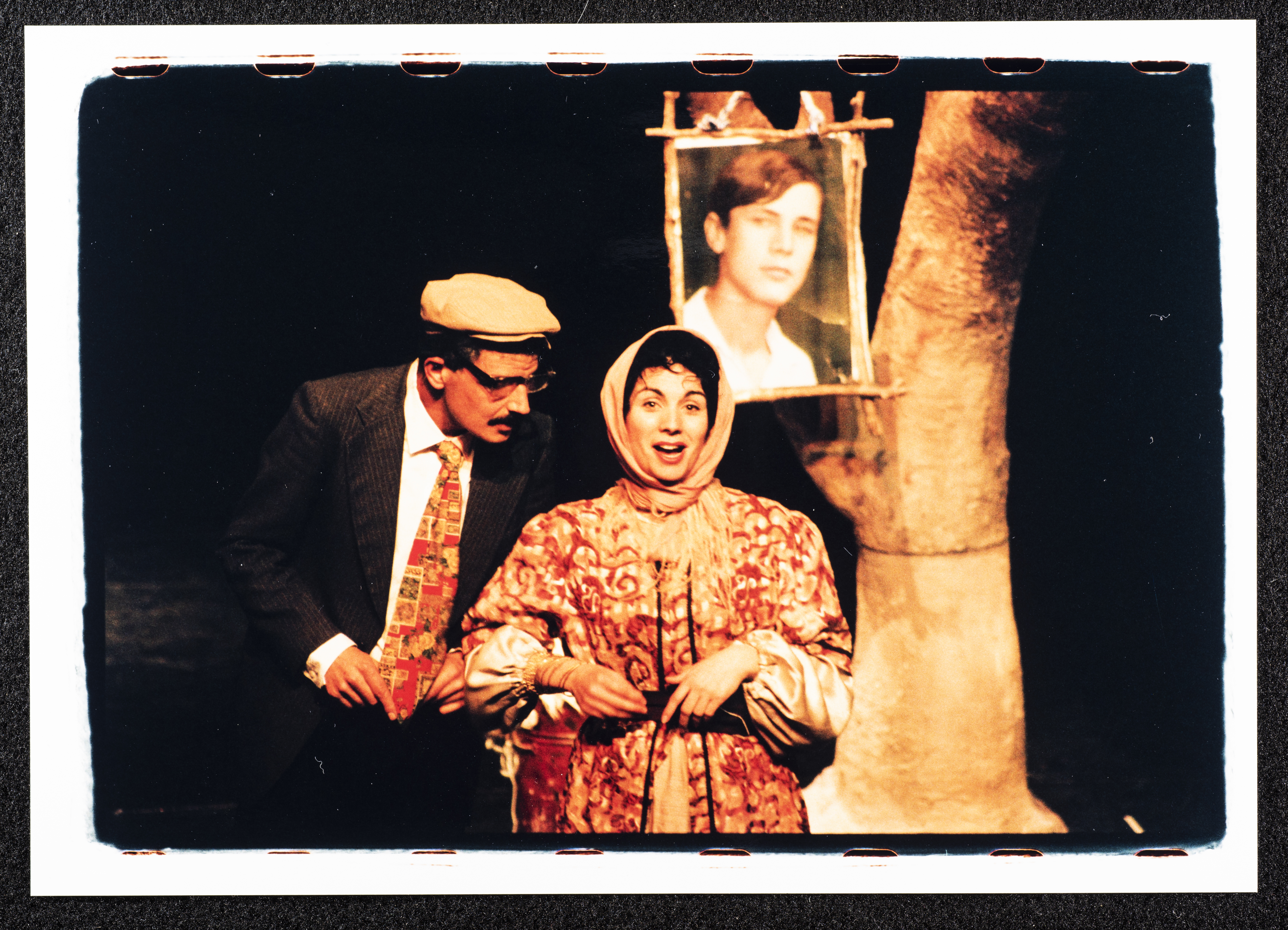 صورة ملونة من عرض لمسرحية المهاجر، التي أخرجها محمد خميس، وأعدها جورج ابراهيم. عرضت مسرحية المهاجر في القدس والجليل والأردن وسوريا وتونس. كما وحازت هذه المسرحية على جائزة أفضل اخراج وأفضل ملابس في مهرجان قرطاج بتونس. المسرحية من تمثيل: محمد البكري، مكرم خوري، محمود عوض، خالد المصو، وليد عبد السلام، جورج ابراهيم، سلوى نقارة، عرين عمري، حسام ابو عيشة، بسام زعمط.