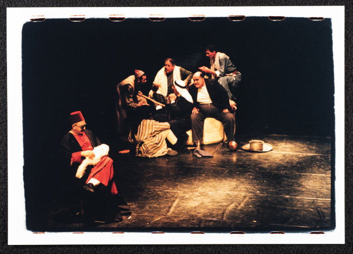 Taken in 1997, this colour photograph captures a freeze of al-Kasaba Theater and Cinematheque's play, "al-Mahajir" [the immigrant]. Directed by Muhammad Mekhmas, the play ran in Jerusalem, Galilee, Jordan, Syria, and Tunisia, featuring a cast of Palestinian actors, including Muhammad al-Bakry, Makram Khury, Mahmud ʿawad, Khalid al-Maṣu, Walid ʿabdelsalam, George Ibrahim, Salwa Naqara, ʿarin ʿumary, Husam abu ʿaysha, and Bassam Zuʿmut.
