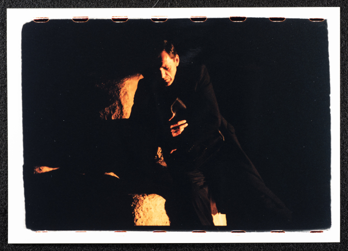 Taken in 1997, this colour photograph captures a freeze of al-Kasaba Theater and Cinematheque's play, "al-Mahajir" [the immigrant]. Directed by Muhammad Mekhmas, the play ran in Jerusalem, Galilee, Jordan, Syria, and Tunisia, featuring a cast of Palestinian actors, including Muhammad al-Bakry, Makram Khury, Mahmud ʿawad, Khalid al-Maṣu, Walid ʿabdelsalam, George Ibrahim, Salwa Naqara, ʿarin ʿumary, Husam abu ʿaysha, and Bassam Zuʿmut.