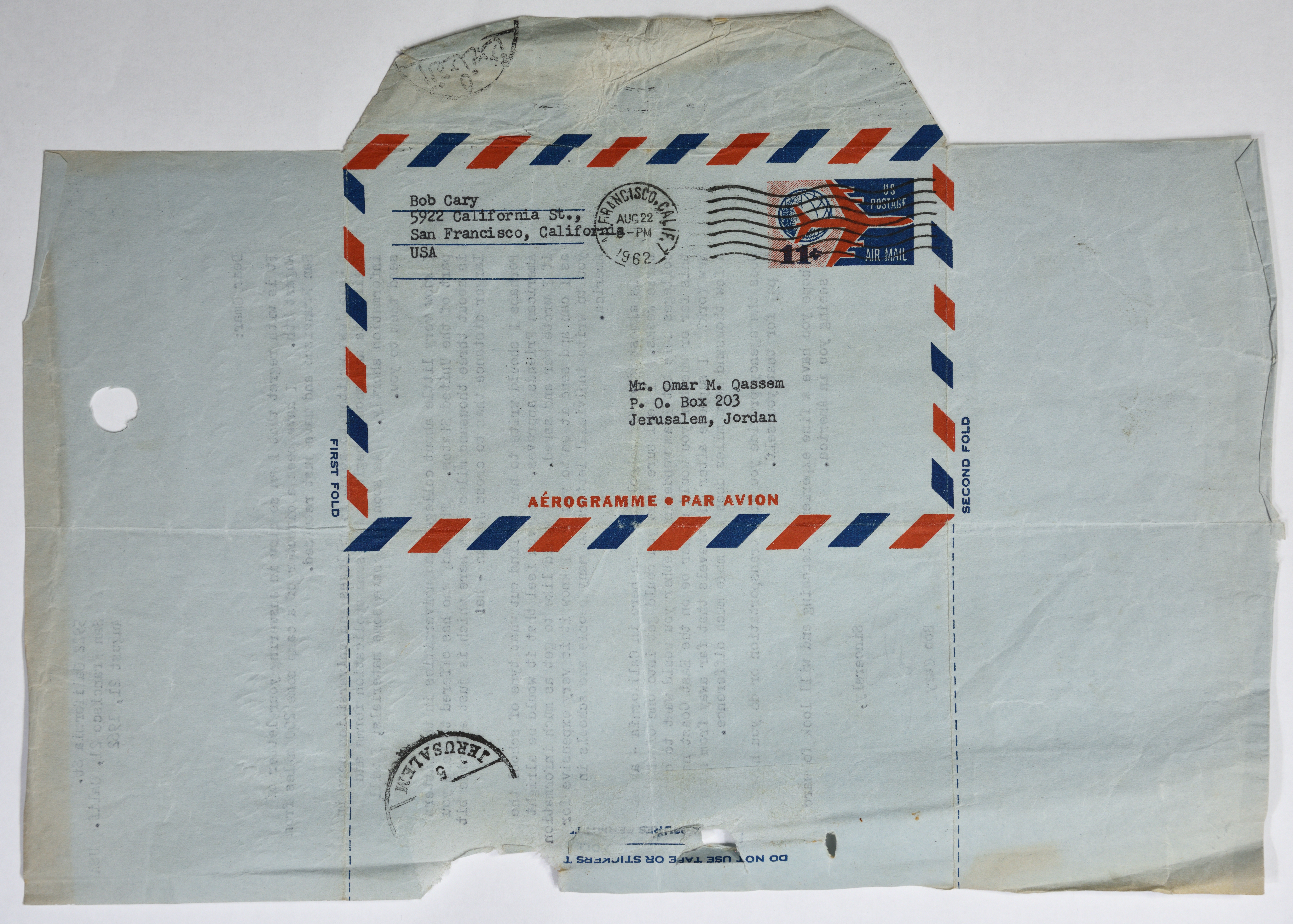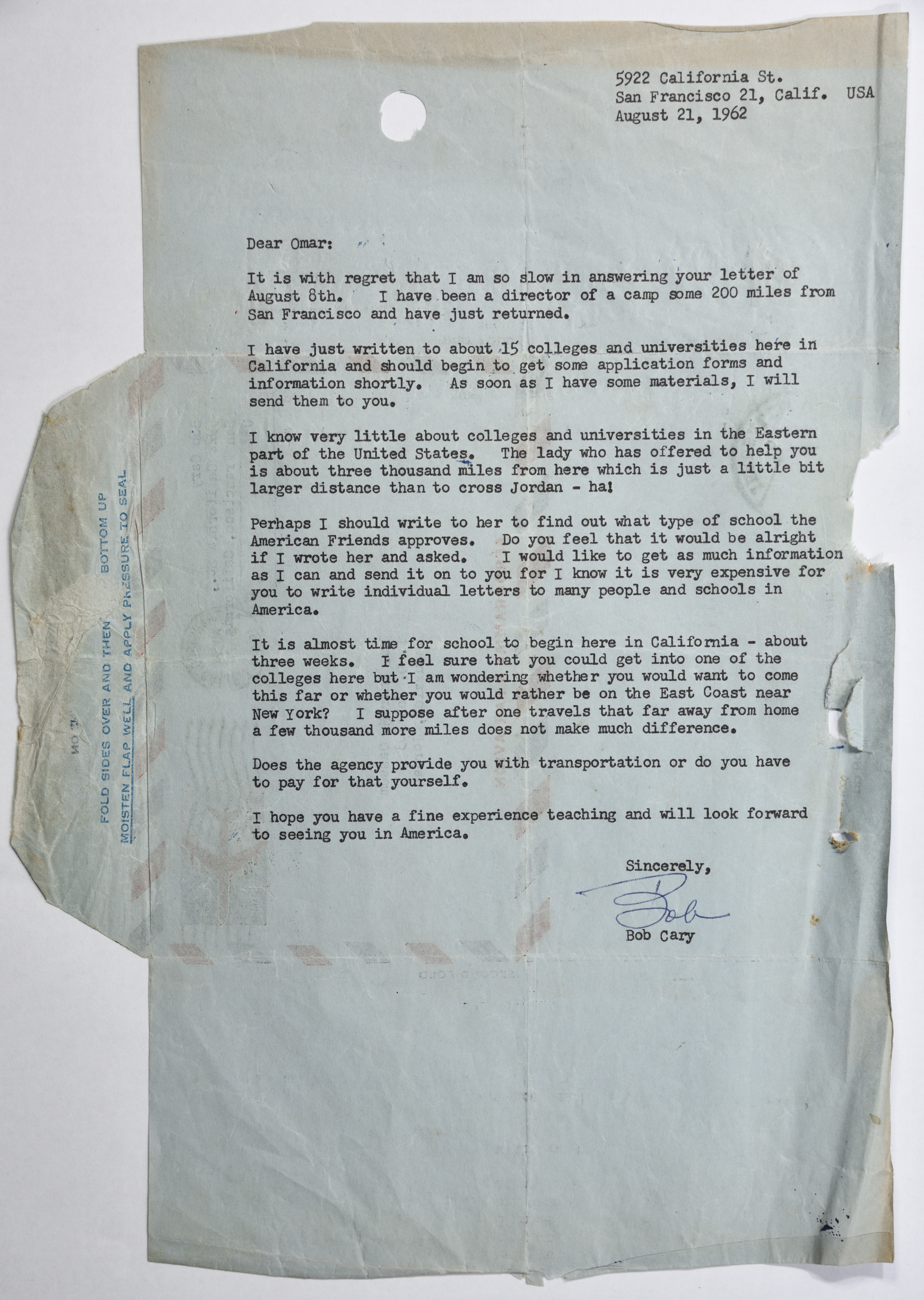 رسالة مؤرخة في 21 آب 1962، أرسلها بوب كاري لعمر القاسم، وفيها يخبره أنه قدَّم 15 طلبًا للجامعات والكليات في كاليفورنيا وما زال ينتظر منهم ردًا.