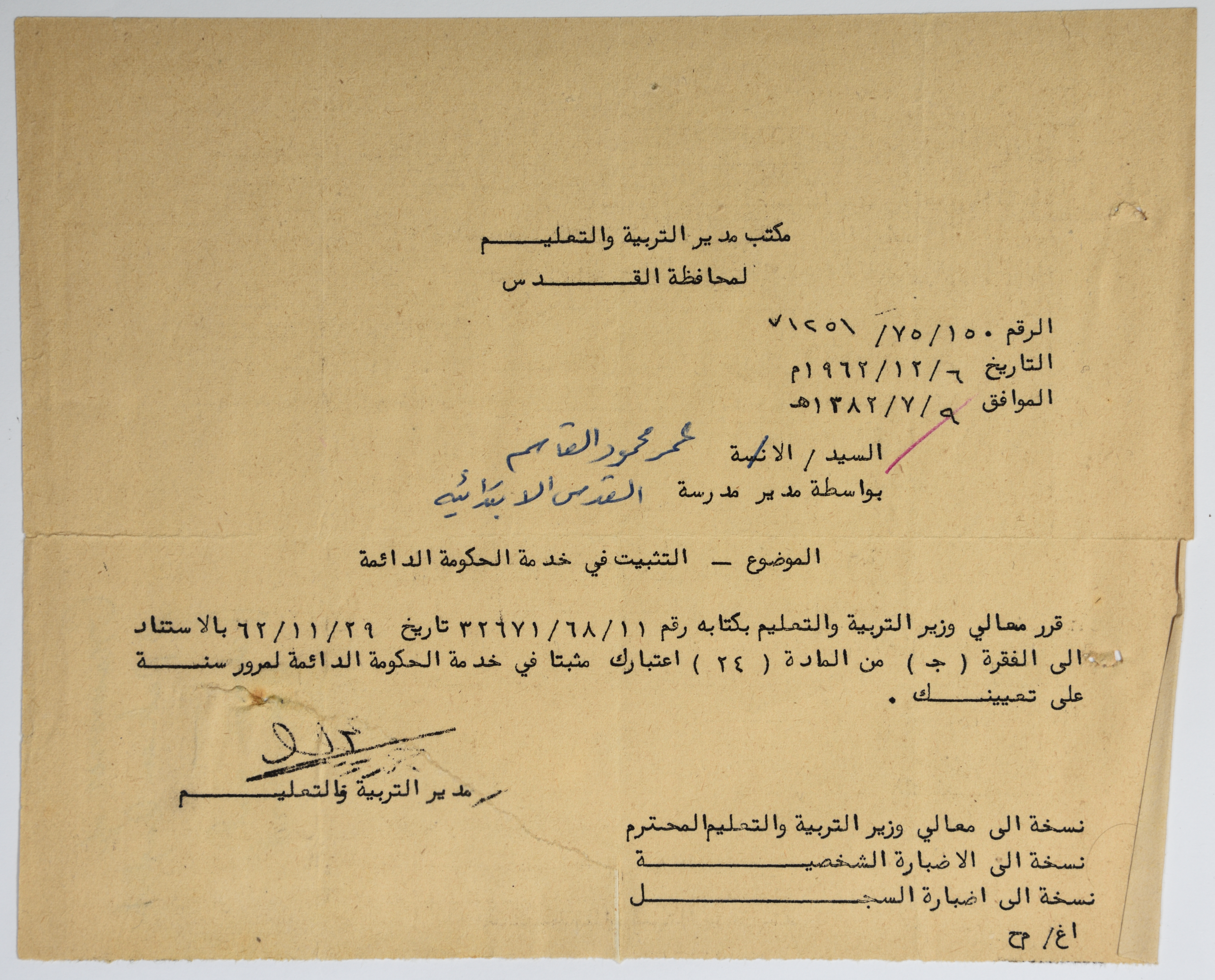 Sent on 6 December 1962, this document shows a letter from the office of the Director of Education in Jerusalem to Omar al-Qasim, informing him of placing him in governmental service.