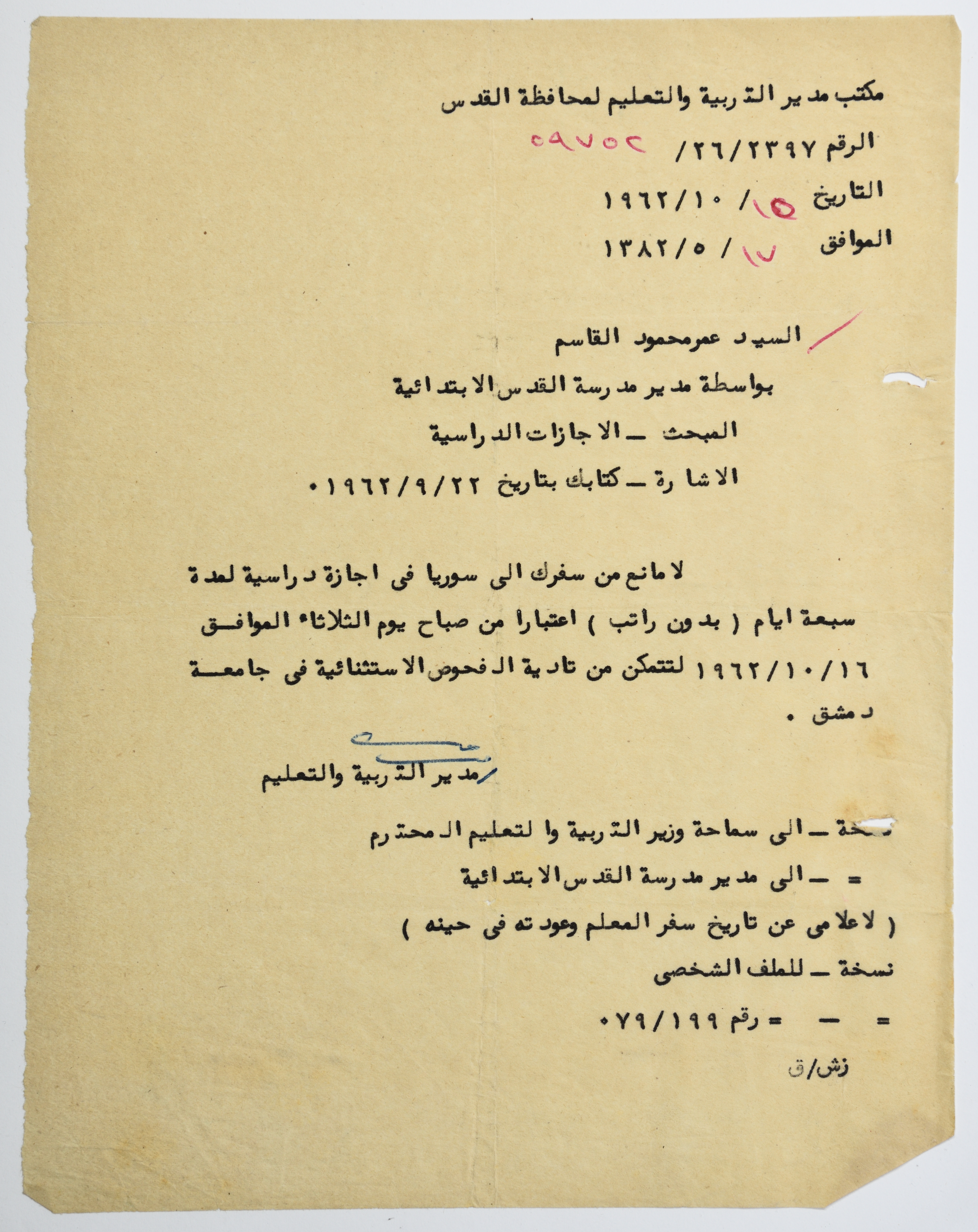 رسالة مؤرخة في 15 تشرين الأول 1962، أرسلها مدير مكتب التربية والتعليم في القدس إلى عمر القاسم، وتفيد بالموافقة على سفره إلى سوريا في إجازة دراسية لمدة سبعة أيام بدون راتب.