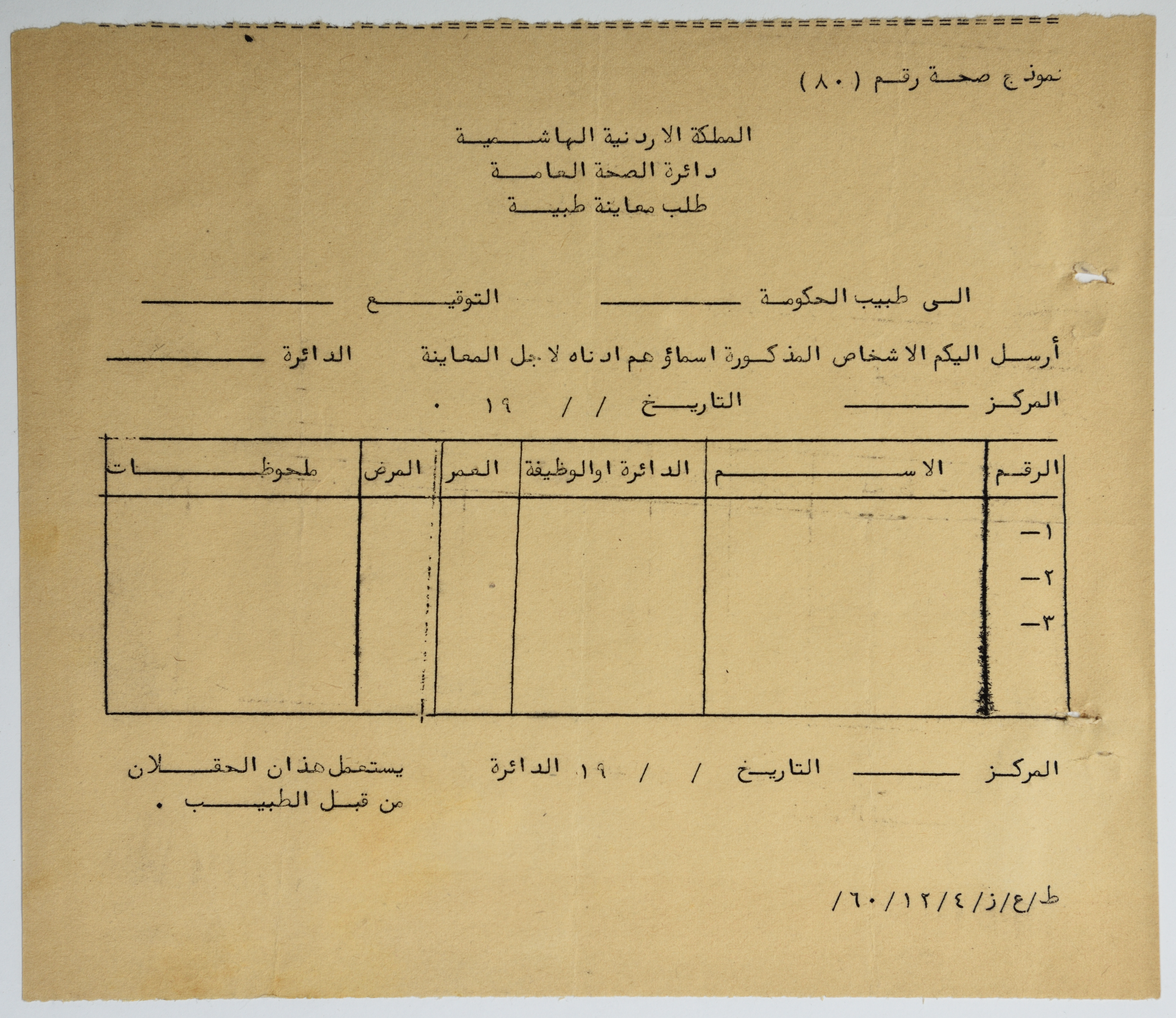 نموذج طلب معاينة طبية صادر عن دائرة الصحة العامة في الأردن في ستينيات القرن العشرين.