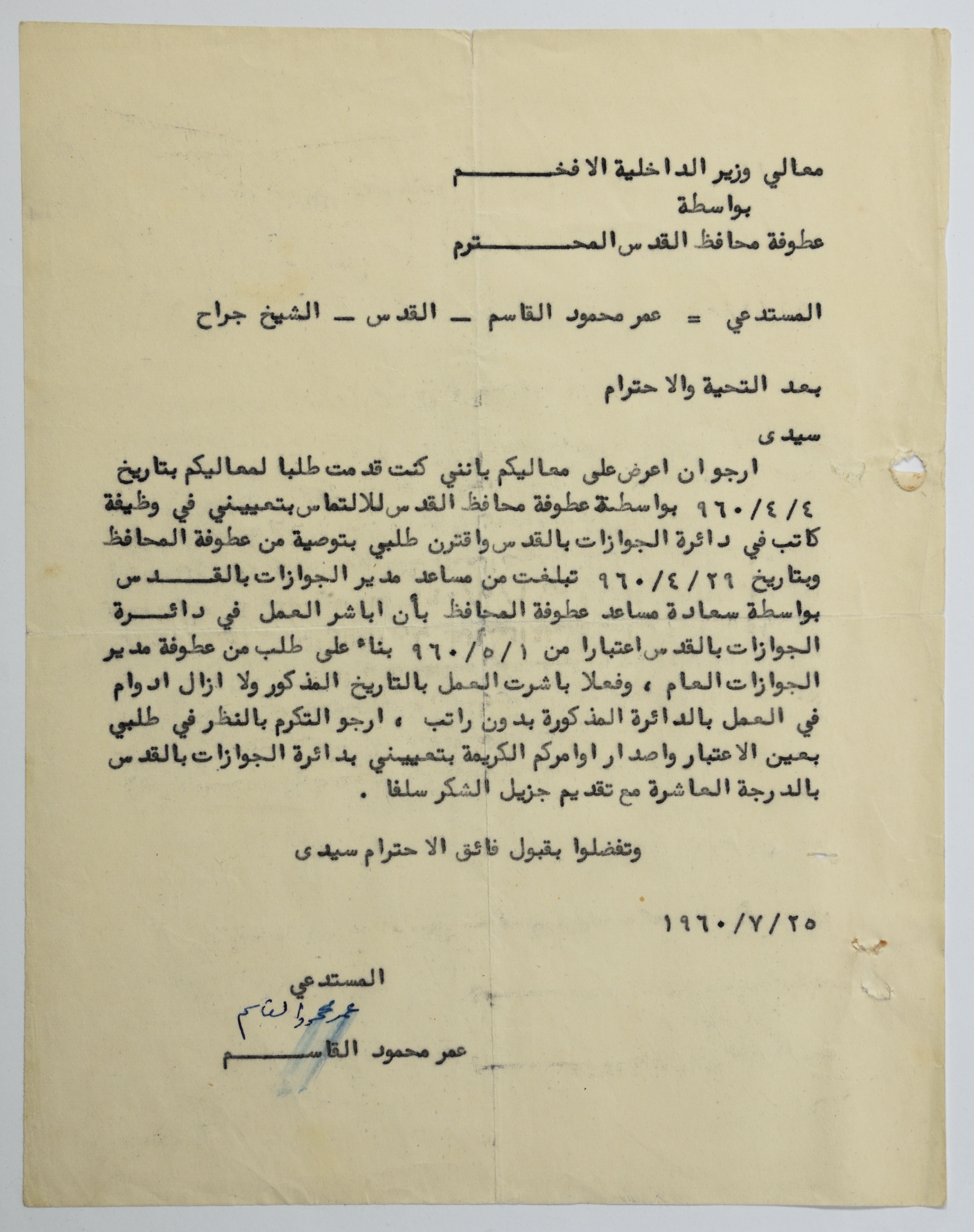 رسالة من عمر القاسم إلى دائرة الجوازات، القدس، 25 تموز 1960
