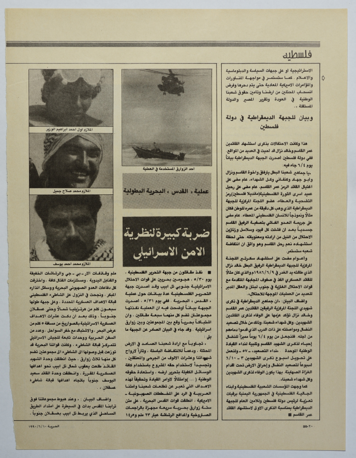 ورقة من مجلة الحرية مؤرخة في 10 حزيران 1990، تحتوي على خبر يتحدث عن تنظيم الجبهة الديمقراطية لتحرير فلسطين لمهرجان ضخم في مخيم اليرموك في مدينة دمشق، إحياءً للذكرى السنوية الأولى لاستشهاد الشهيد عمر القاسم.