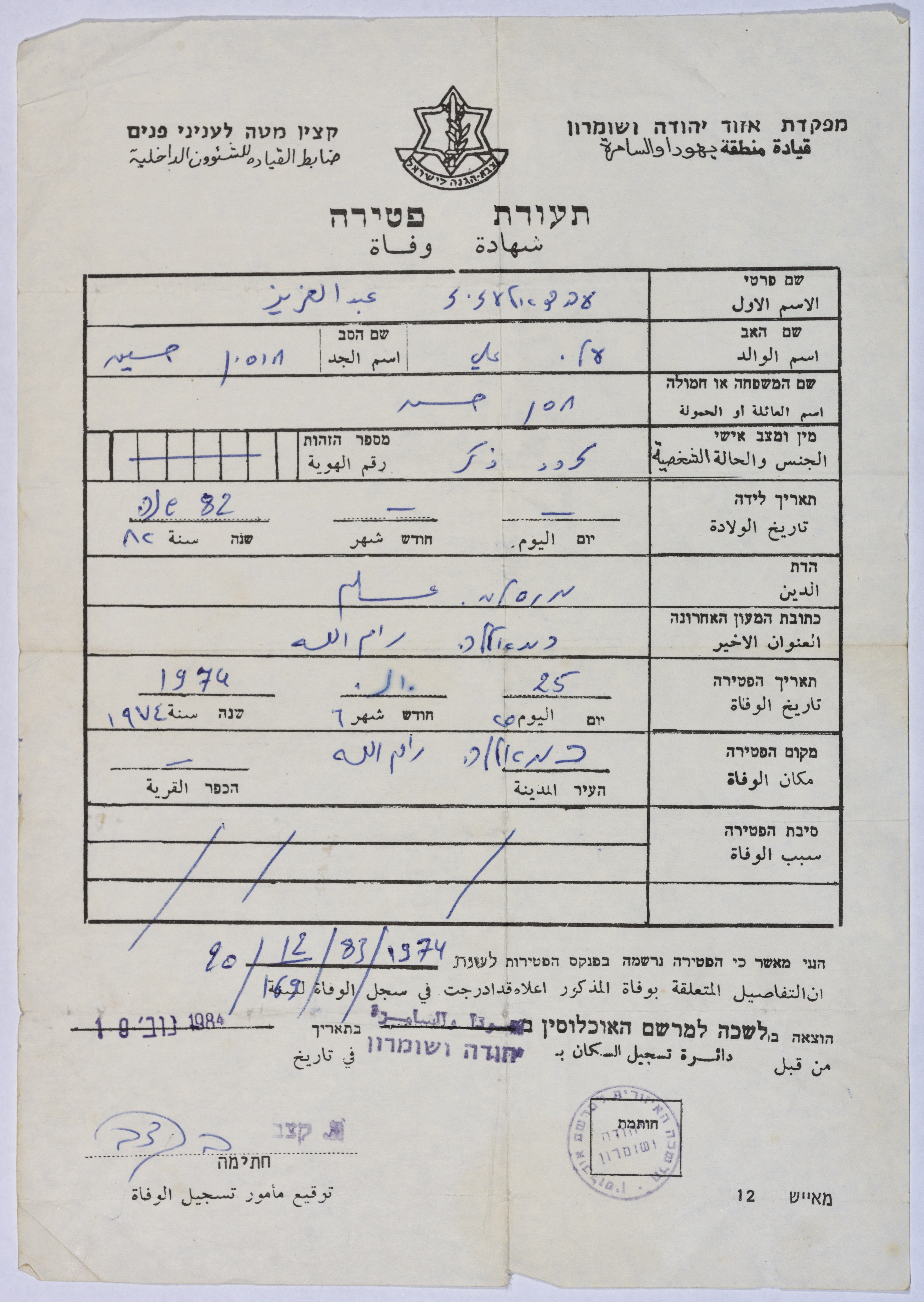 وثيقة صادرة عن الإدارة المدنية ( في فترة الاحتلال الاسرائيلي للضفة الغربية) عام 1974 وهي عبارة عن شهادة وفاة للسيد عبد العزيز علي حسن من قرية برهام قضاء رام الله ، يظهر في الوثيقة ختم دائرة تسجيل السكان وتوقيع مأمور تسجيل الوفاة في الدائرة