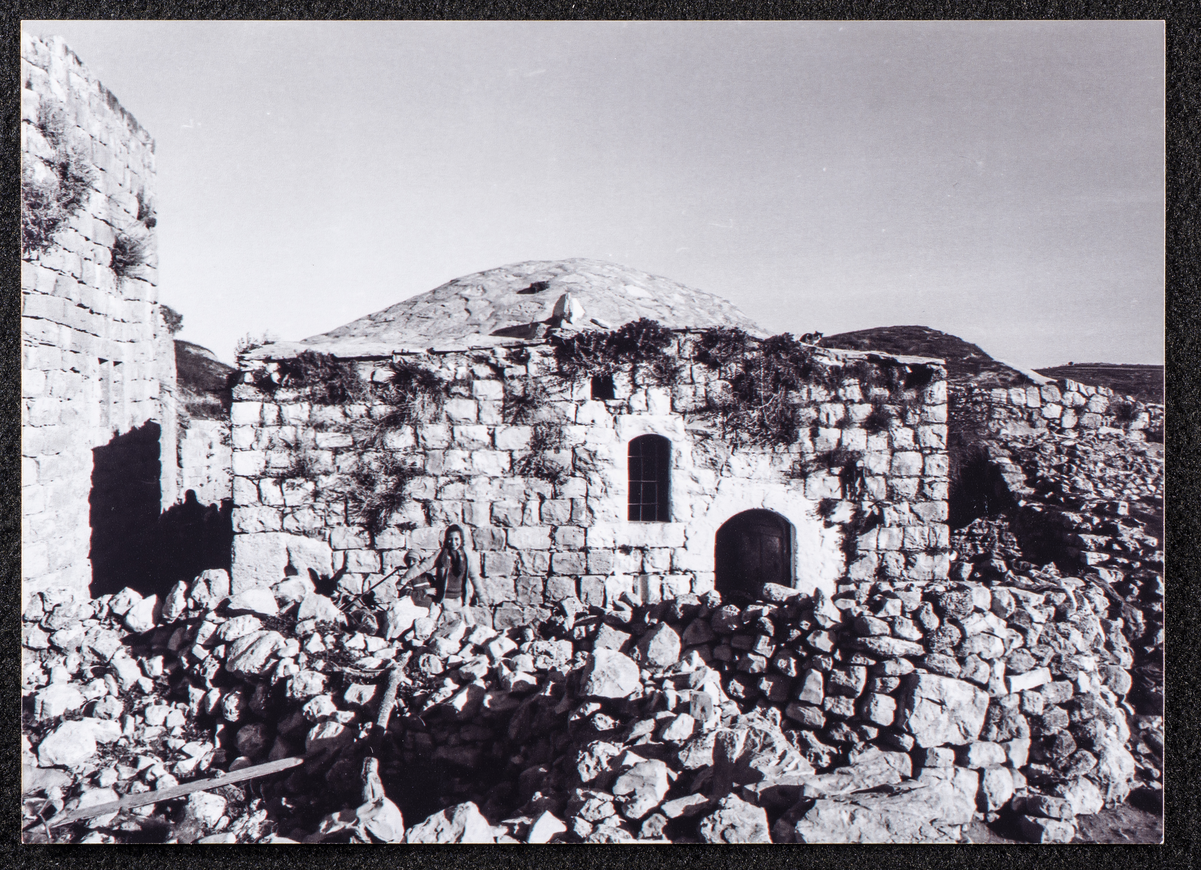 A black-and-white landscape photograph of an antiquated house in Arraba village, the Israeli-occupied governorate of Jenin.