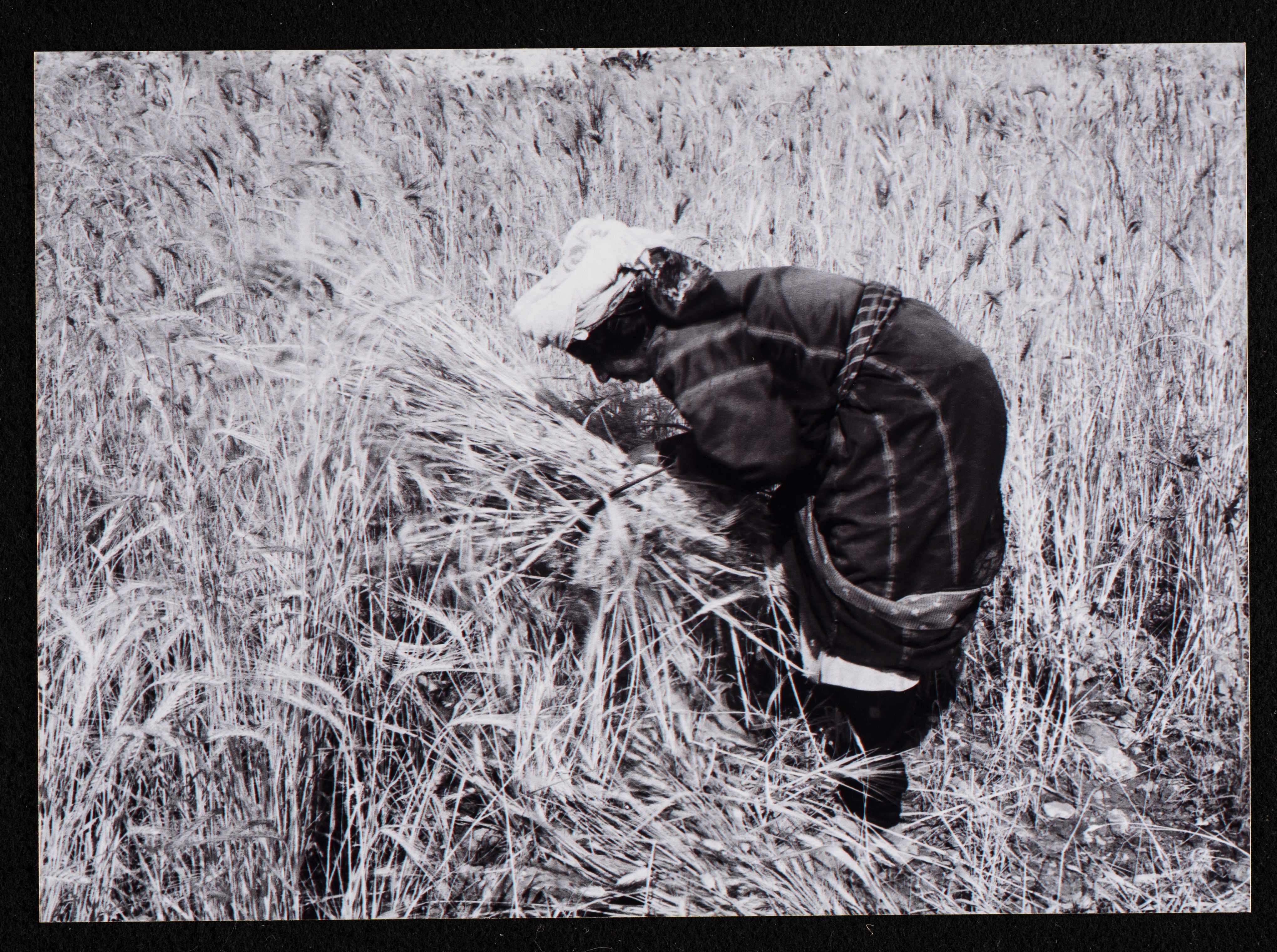 صورة غير ملونة ترصد جانبًا من أحد مواسم حصاد القمح في ميدنة البيرة المحتلة.