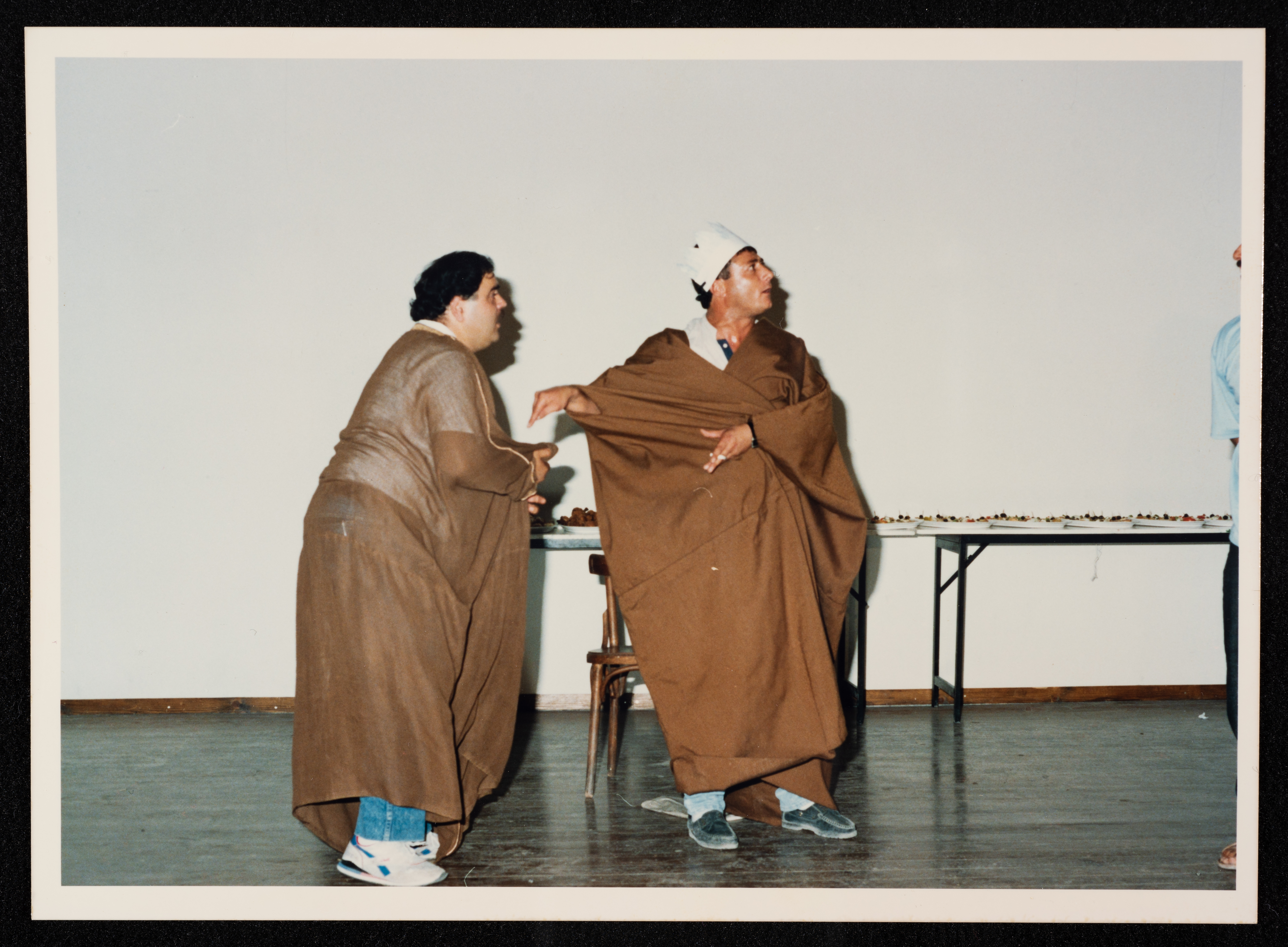 Taken in 1998, this colour photograph captures a glimpse of a workshop for people with disabilities. Held by the Palestinian National Theatre- al-Hakawati, the workshop featured a group of artists.