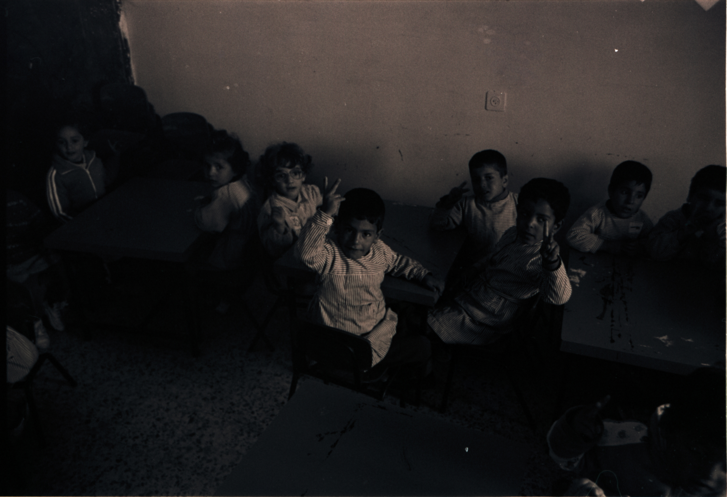 صورة غير ملونة، يظهر فيها مجموعة أطفال اثناء مشاركتهم في العميلة التعليمية في مدرسة بيت ساحور عام 1989. وجدت في مجموعة الصحفي دانيال