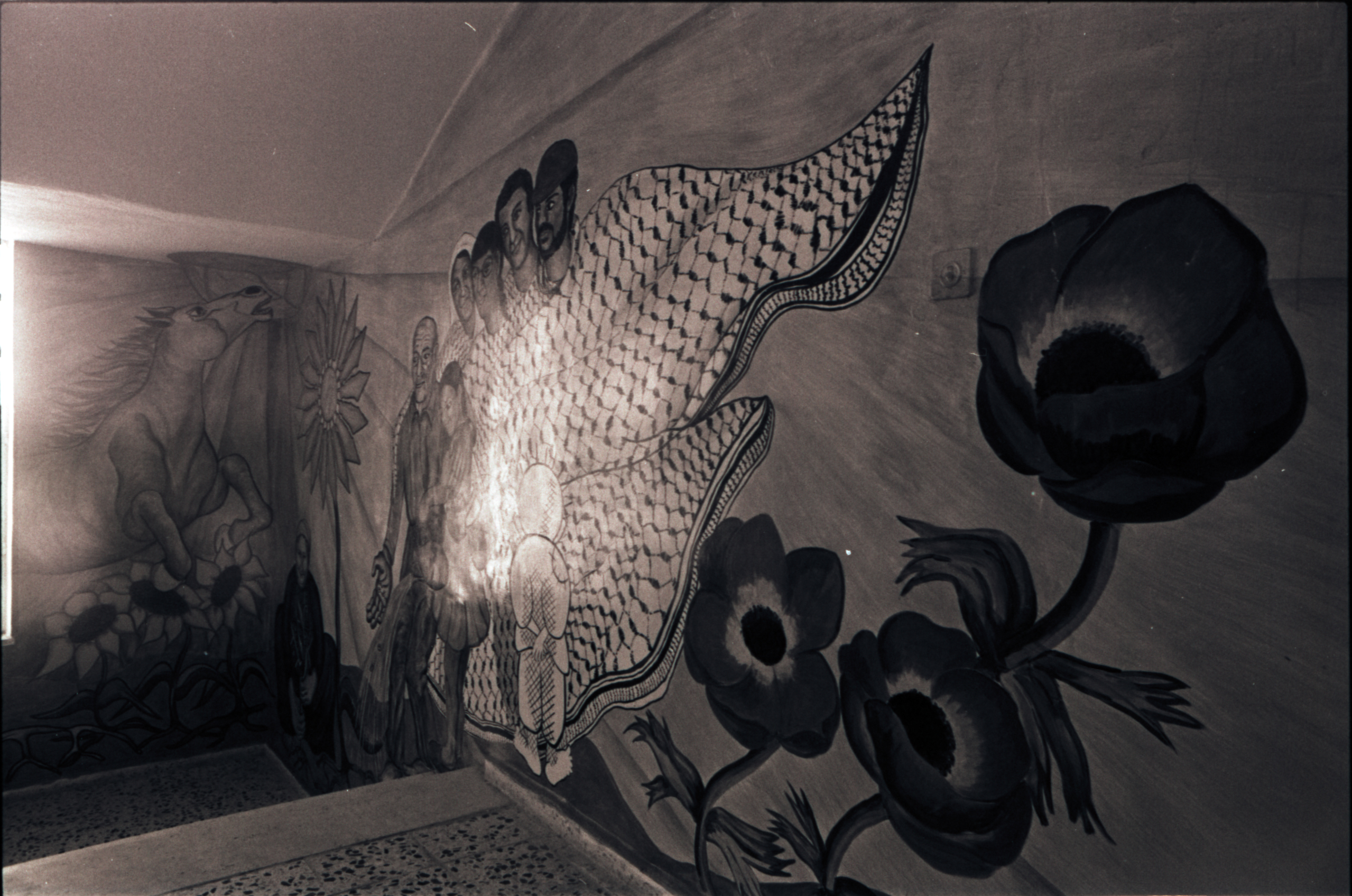 صورة غير ملونة، يظهر في فيها رسومات على حائط في بلدة بيت ساحور عام 1989. وجدت في مجموعة الصحفي دانيال