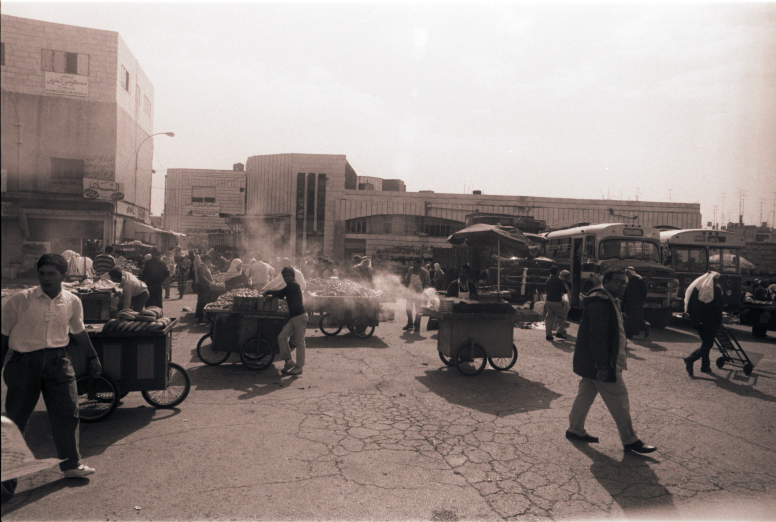 صورة غير ملونة، يظهر فيها باصات ومجموعة أشخاص يتسوقون وايضا يوجد باعئون الخضار في بلدة بيت ساحور عام 1989. وجدت في مجموعة الصحفي دانيال