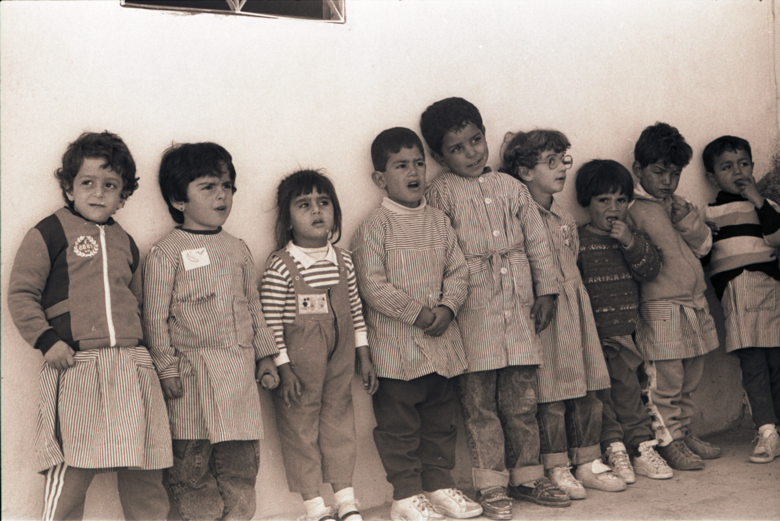 صورة غير ملونة، يظهر فيها مجموعة أطفال خلال مشاركتهم في العملية التعليمة في المدرسة بيت ساحور عام 1989. وجدت في مجموعة الصحفي دانيال