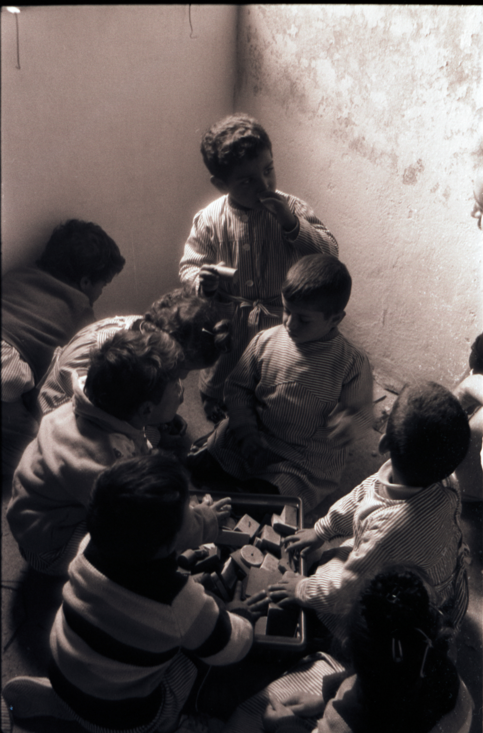 صورة غير ملونة، يظهر فيها مجموعة أطفال خلال مشاركتهم في العملية التعليمية في مدرسة بيت ساحور عام 1989. وجدت في مجموعة الصحفي دانيال