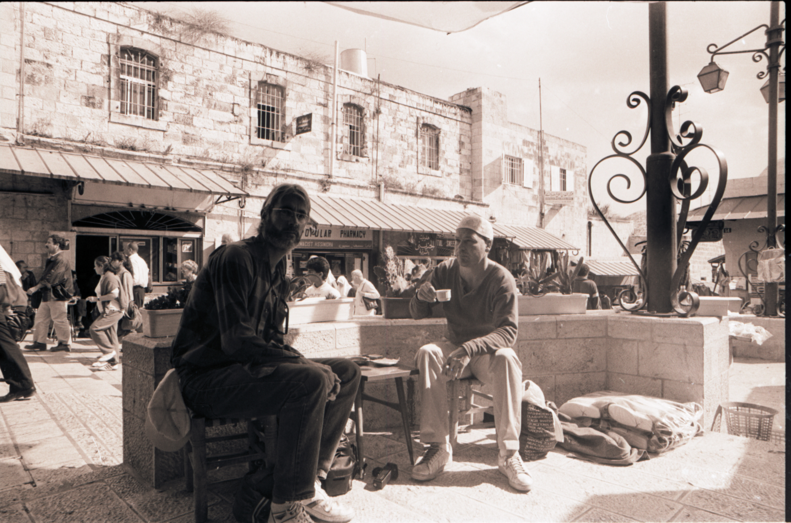 صورة غير ملونة، يظهر فيها رجلين يحتسيان قهوة في المقهى بلدة بيت ساحور عام 1989. وجدت في مجموعة الصحفي دانيال