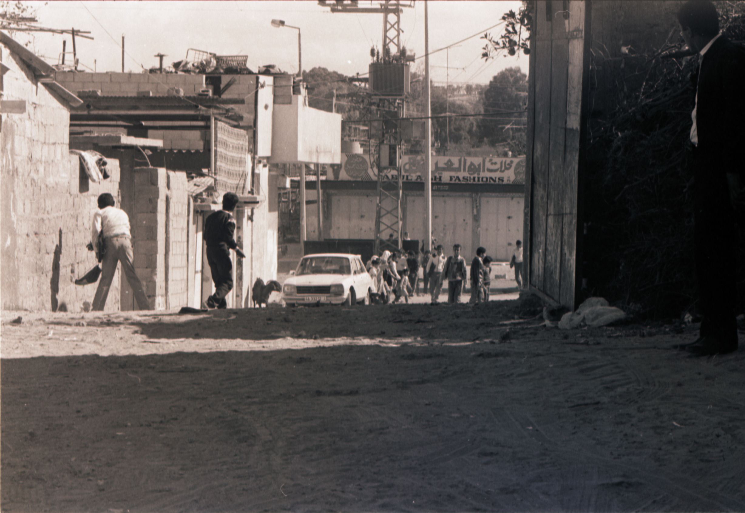 صورة غير ملونة، يظهر فيها مجموعة اشخاص في شارع بلدة بيت ساحور امام محلات ابو عرب عام 1989. وجدت في مجموعة الصحفي دانيال