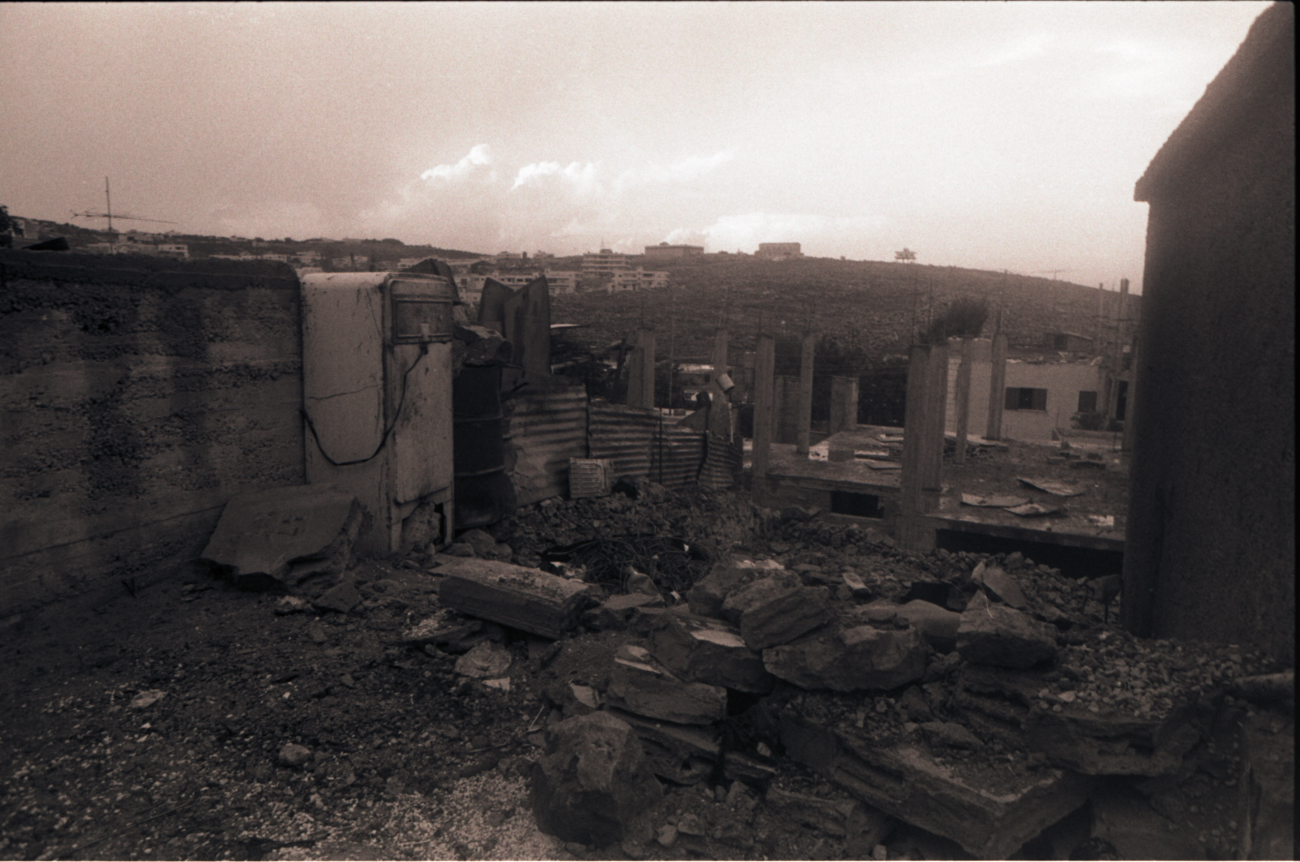 A black-and-white photograph, featuring demolished houses in the middle of the mountains of Beit Sahour in 1989. This photograph was found among the archive of the Journalist Danial H.