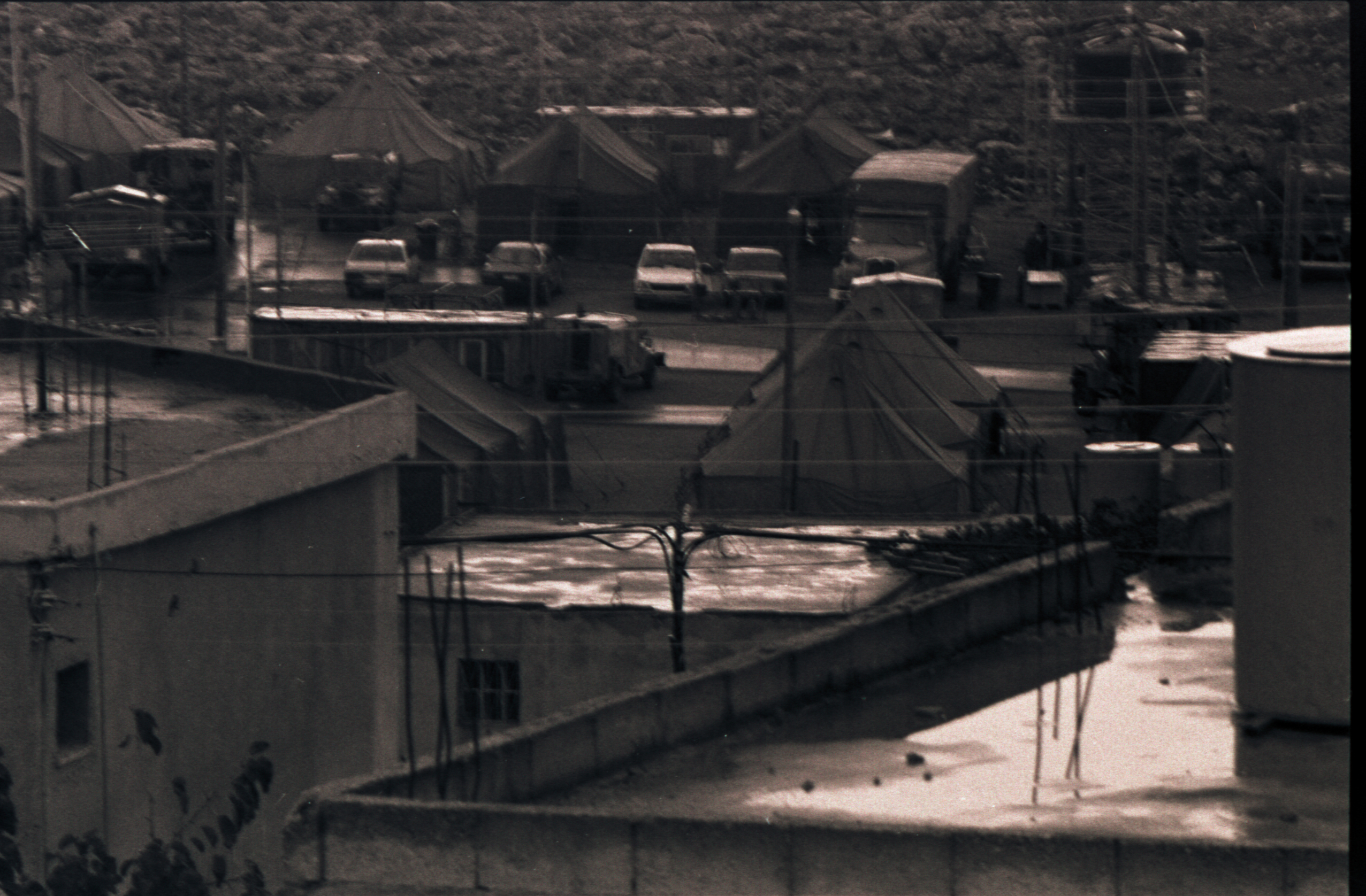 صورة غير ملونة، يظهر فيها اسطح بيوت وسيارات في بلدة بيت ساحور عام 1989. وجدت في مجموعة الصحفي دانيال