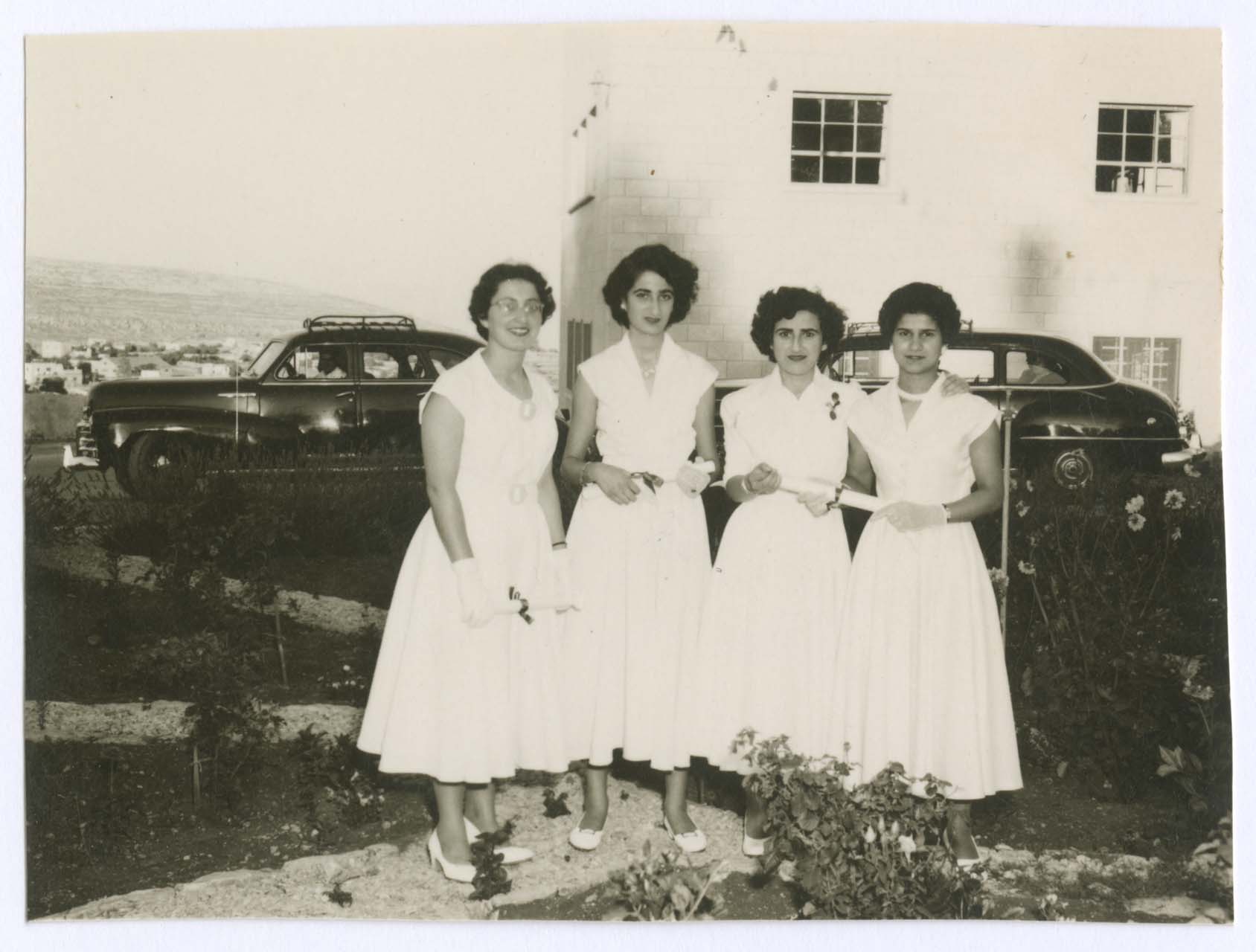 صورة، غير مؤرخة، لأربعة من طالبات مدرسة الفرندز يقفن في حديقة حاملات شهادتهن. وفي الخلفية سيارتين ومنزل.