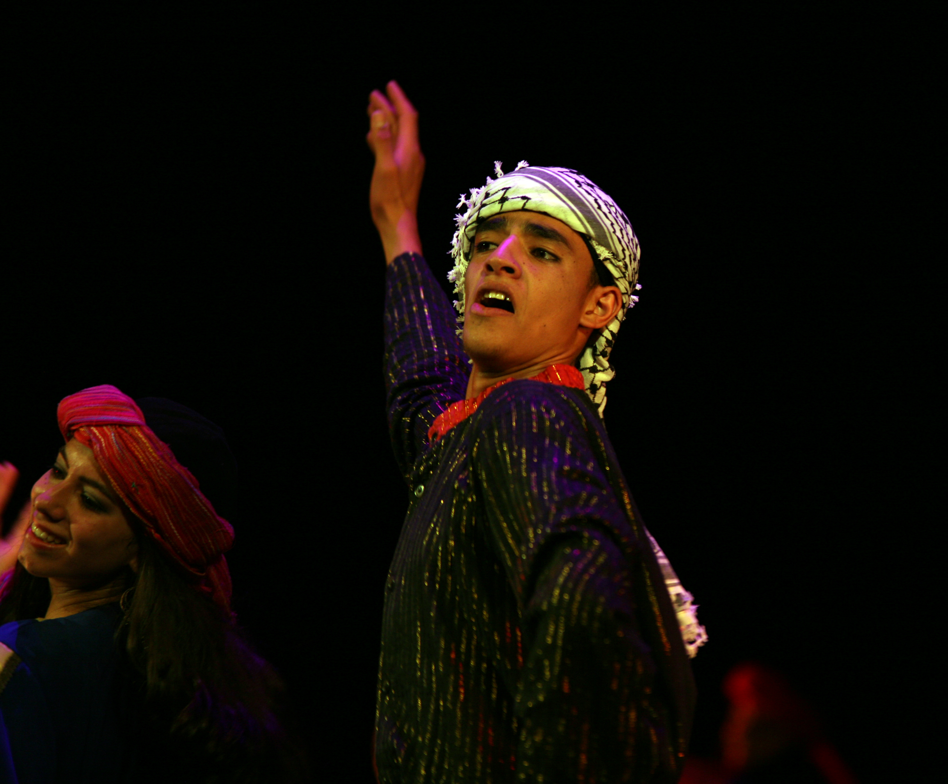 Taken in 2006, this colour photograph shows el-Funoun Palestinian Popular Dance Troupe's dance show, ""Raqsit Shamis" [Dance of Sun].