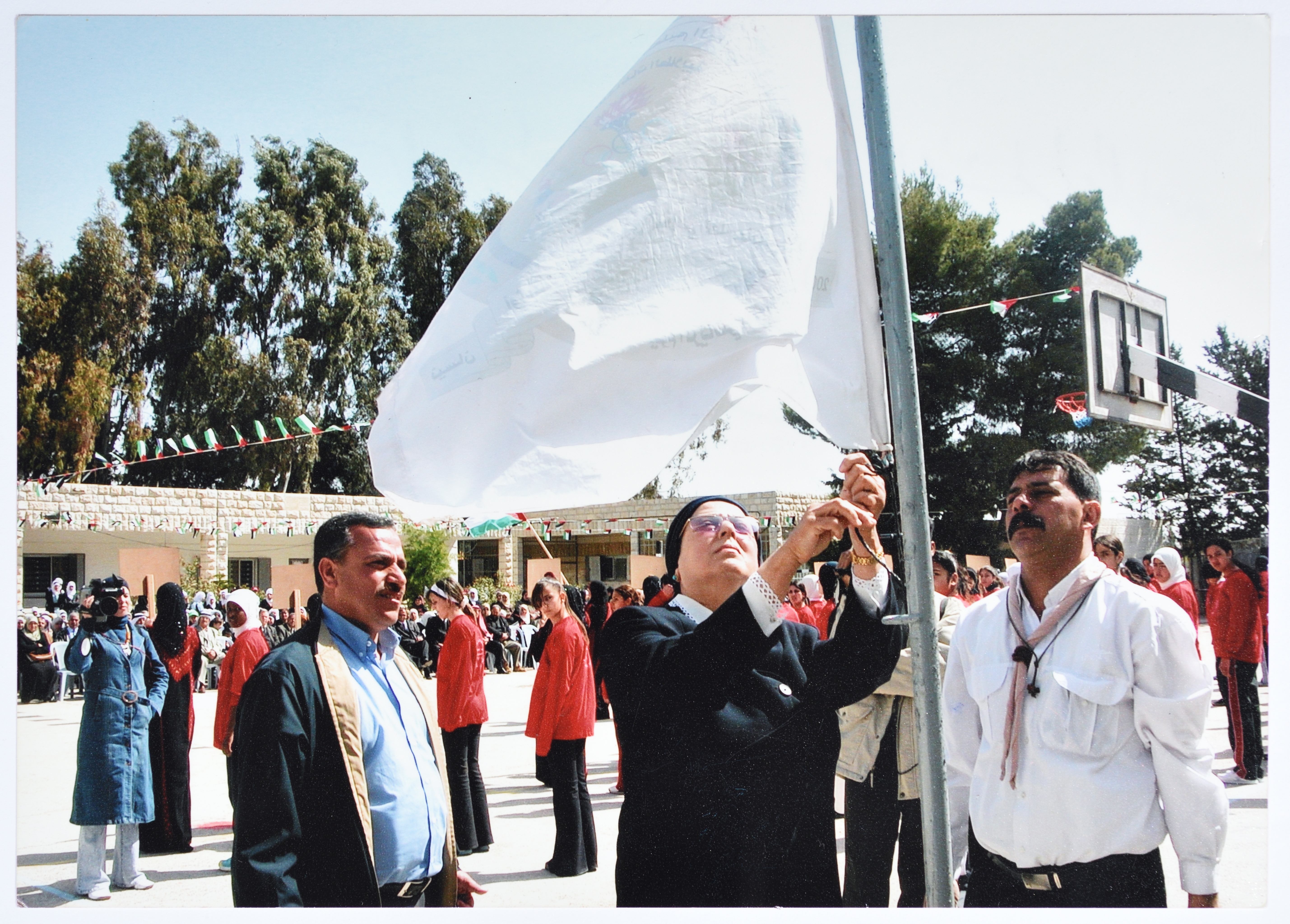 A colour photograph shows Muntaha Jarrár gives the starting signal for the Olympic Games in Turmus'ayya.