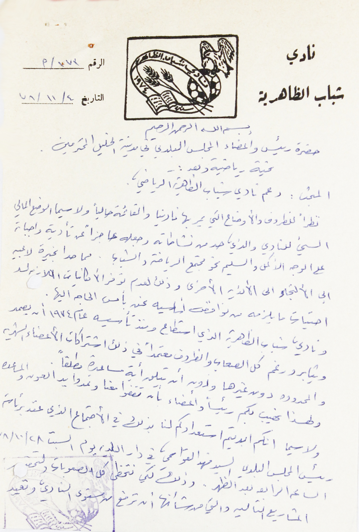 .وثيقة مكتوبة باللغة العربية، وهي رسالة من نادي شباب الظاهريه الى رئيس واعضاء المجلس البلدي في الخليل حول دعم نادي شباب الظاهرية الرياضي