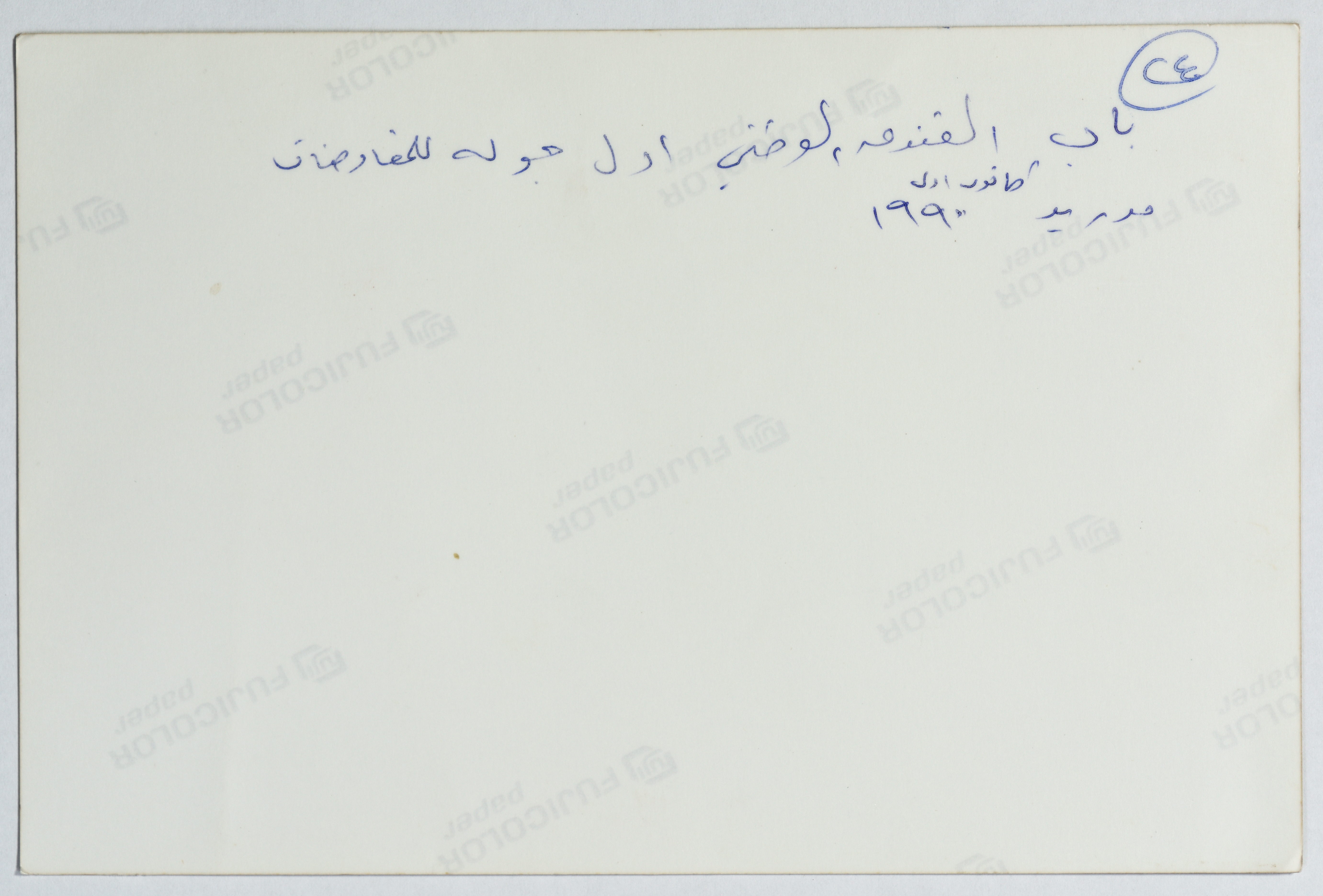 Taken in December 1990, this photograph shows Zahira Kamal at the front gate of the National Hotel in Jerusalem during the first round of the Madrid peace talks.