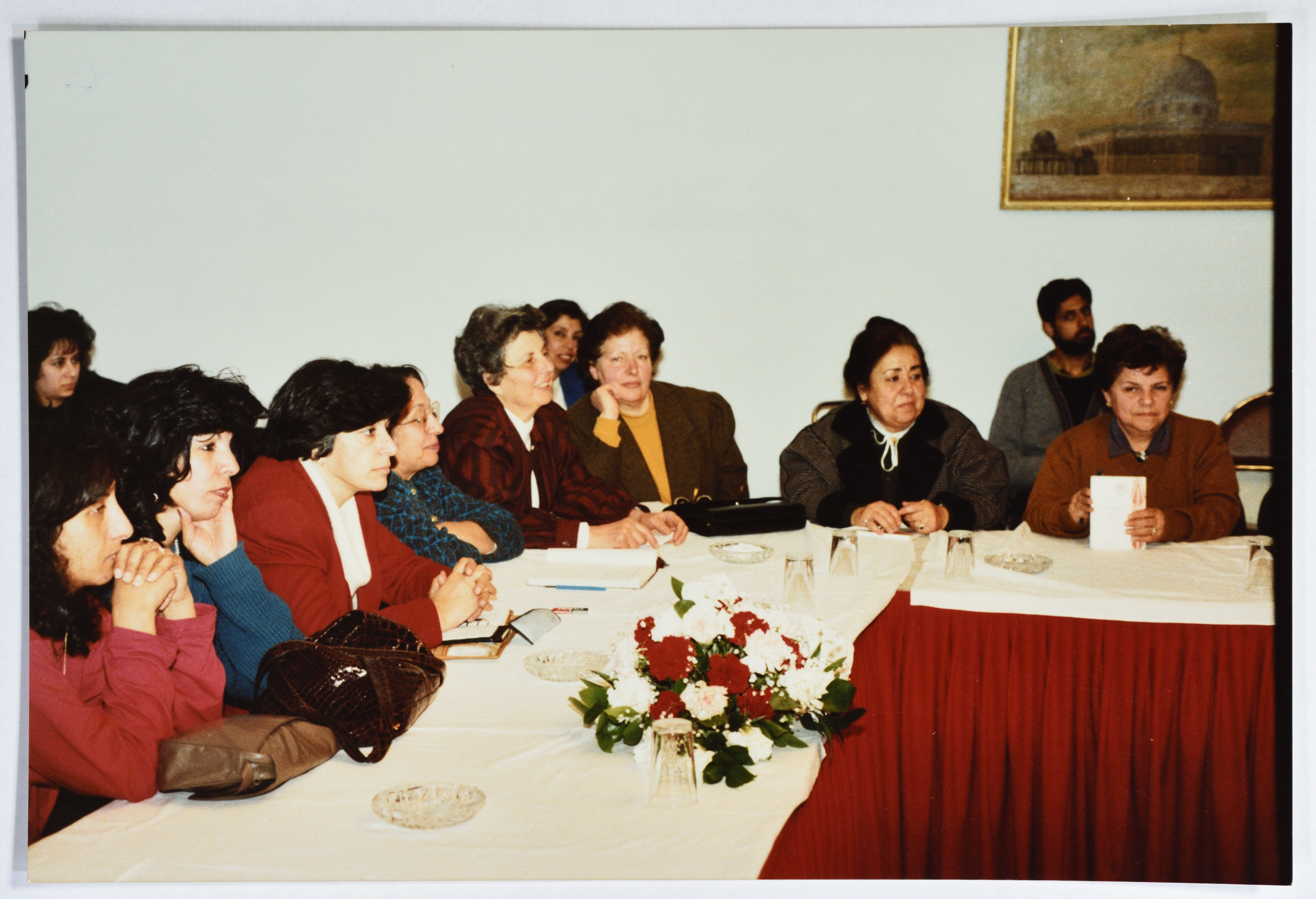 اجتماع لطاقم شؤون المرأة عام 1996 بحضور فريدة حسين، رولى أبو دحو، هيام المحتسب، ريما ترزي، ساما عويضة، زهيرة كمال، حليمة أبو صلب.