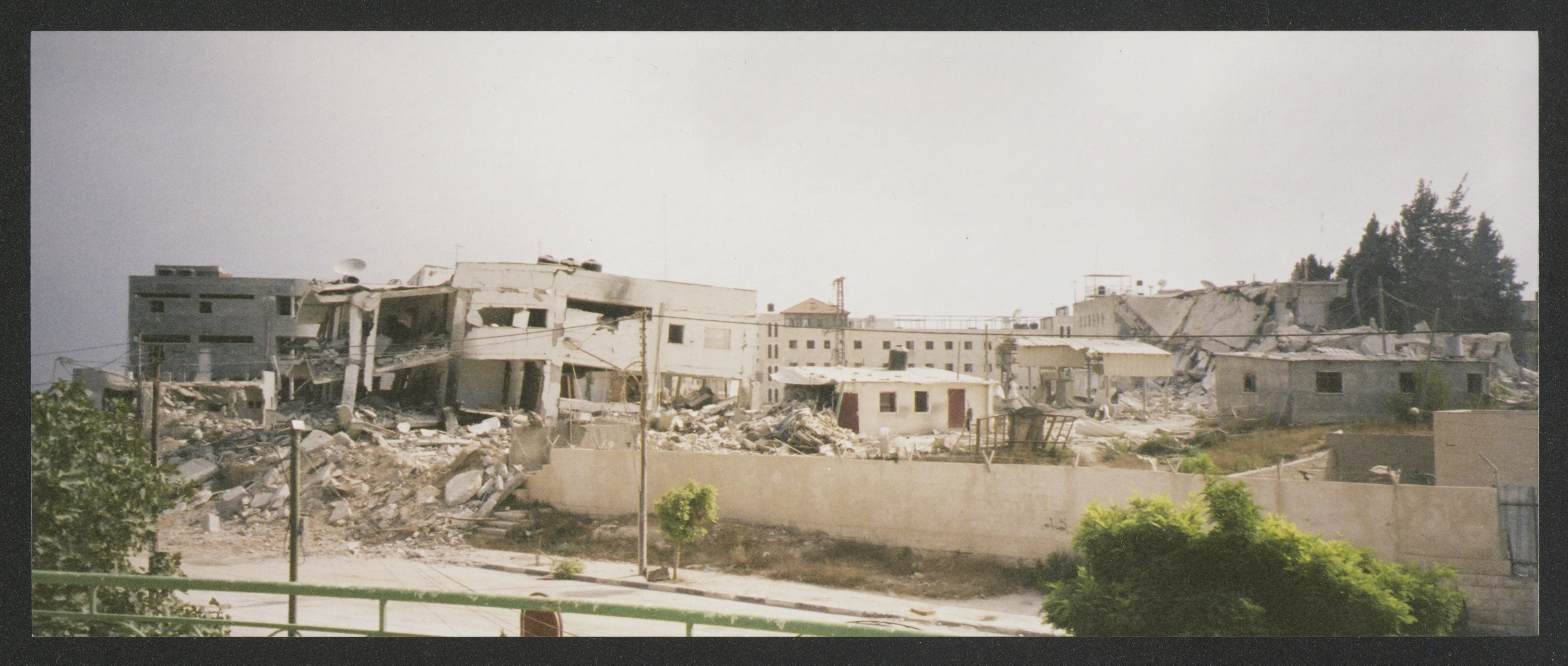 صورة ملونة لمبنى الرئاسة الفلسطينية "المقاطعة" في رام الله بعد تدميره عام 2002.