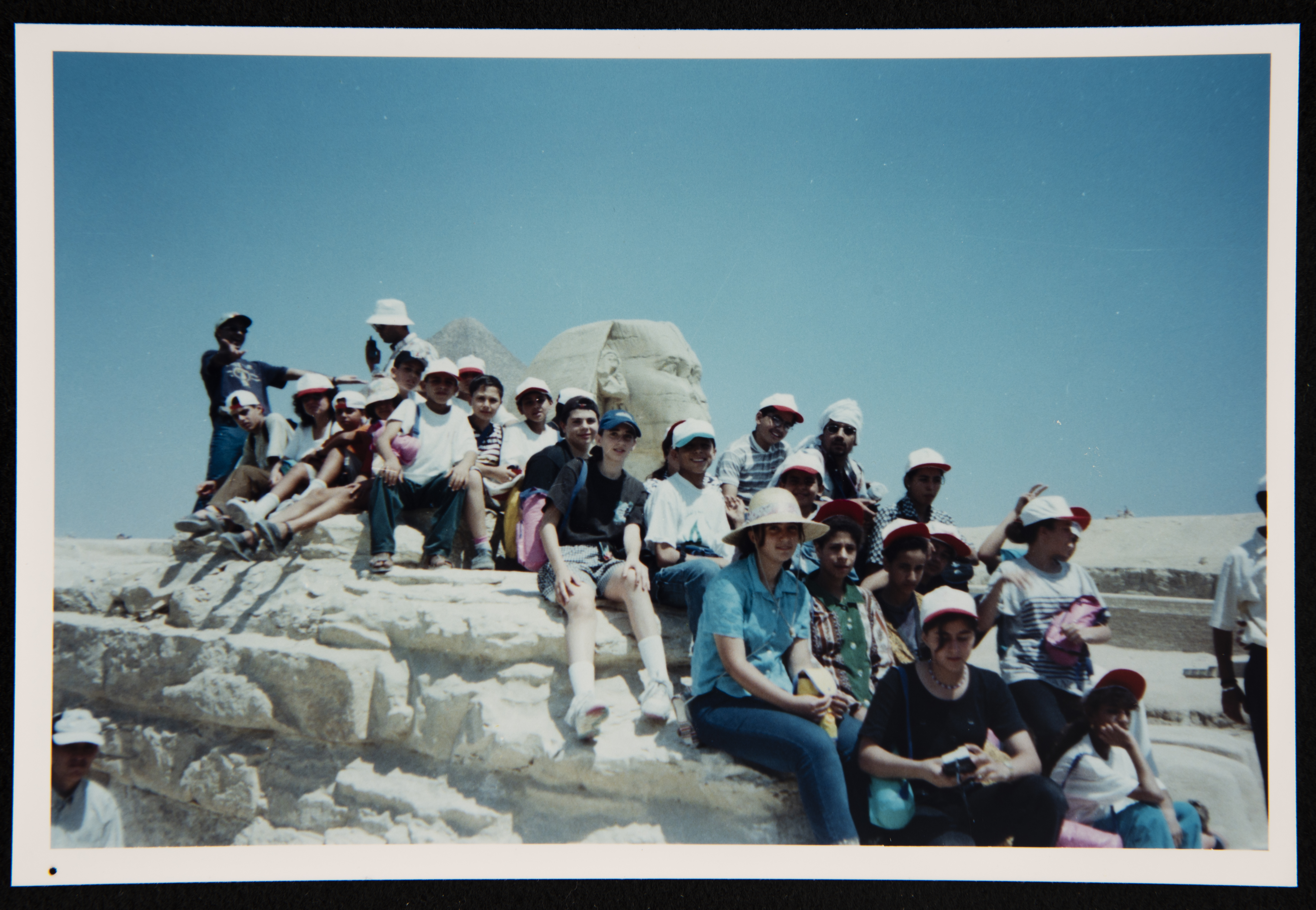 صورة ملونة ترصد طلبة من مسرح عناد أثناء رحلتهم إلى مصر عام 2001 للمشاركة في مخيم "بلا اسم للفنون". ضم المخيم مشاركين من عدة مناطق من فلسطين المحتلة، والأردن، ولبنان، ومصر.