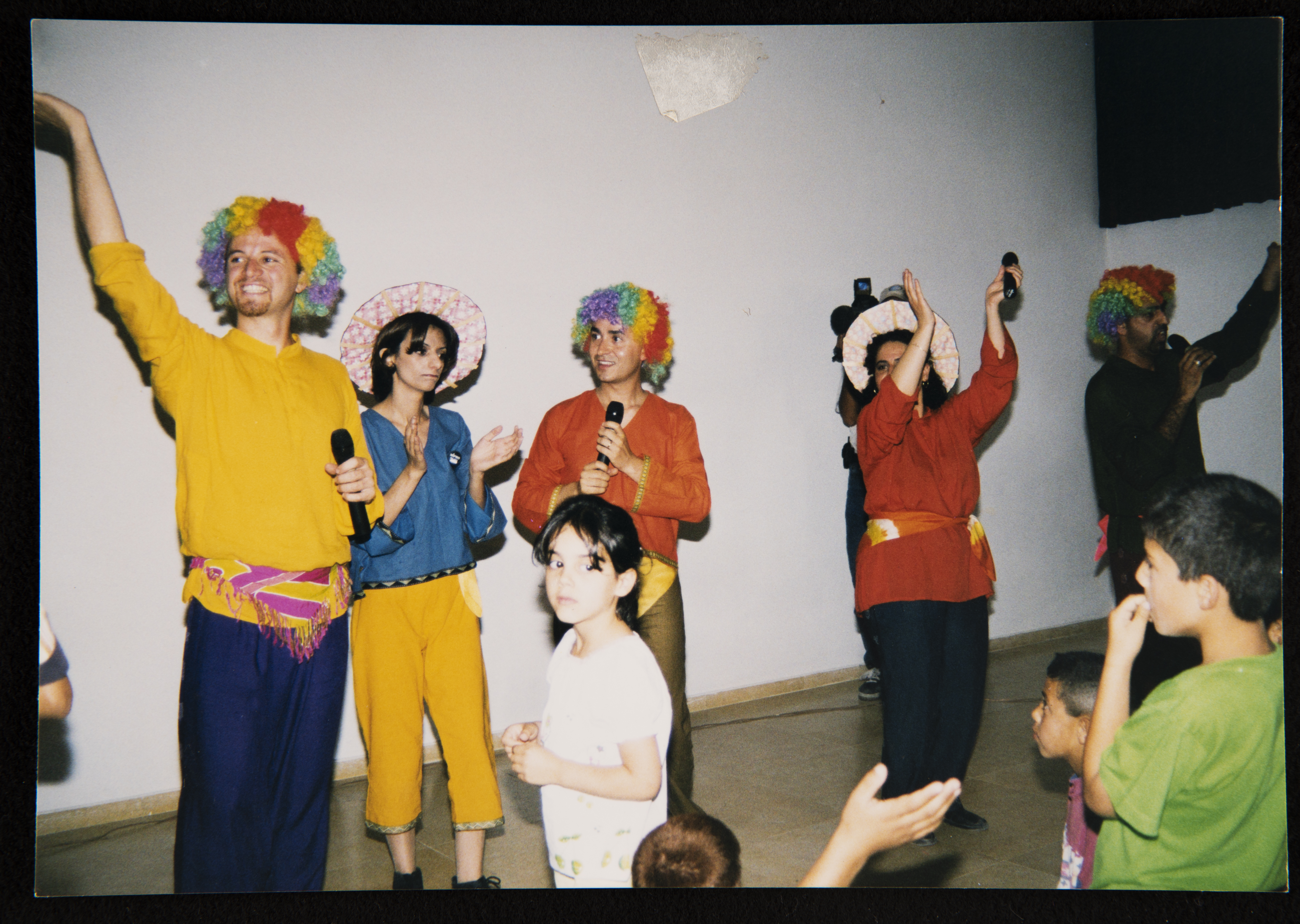 صورة ملونة من عرض مسرحية كراكوزي بمشاركة مجموعة من الأطفال في مدينة بيت لحم.