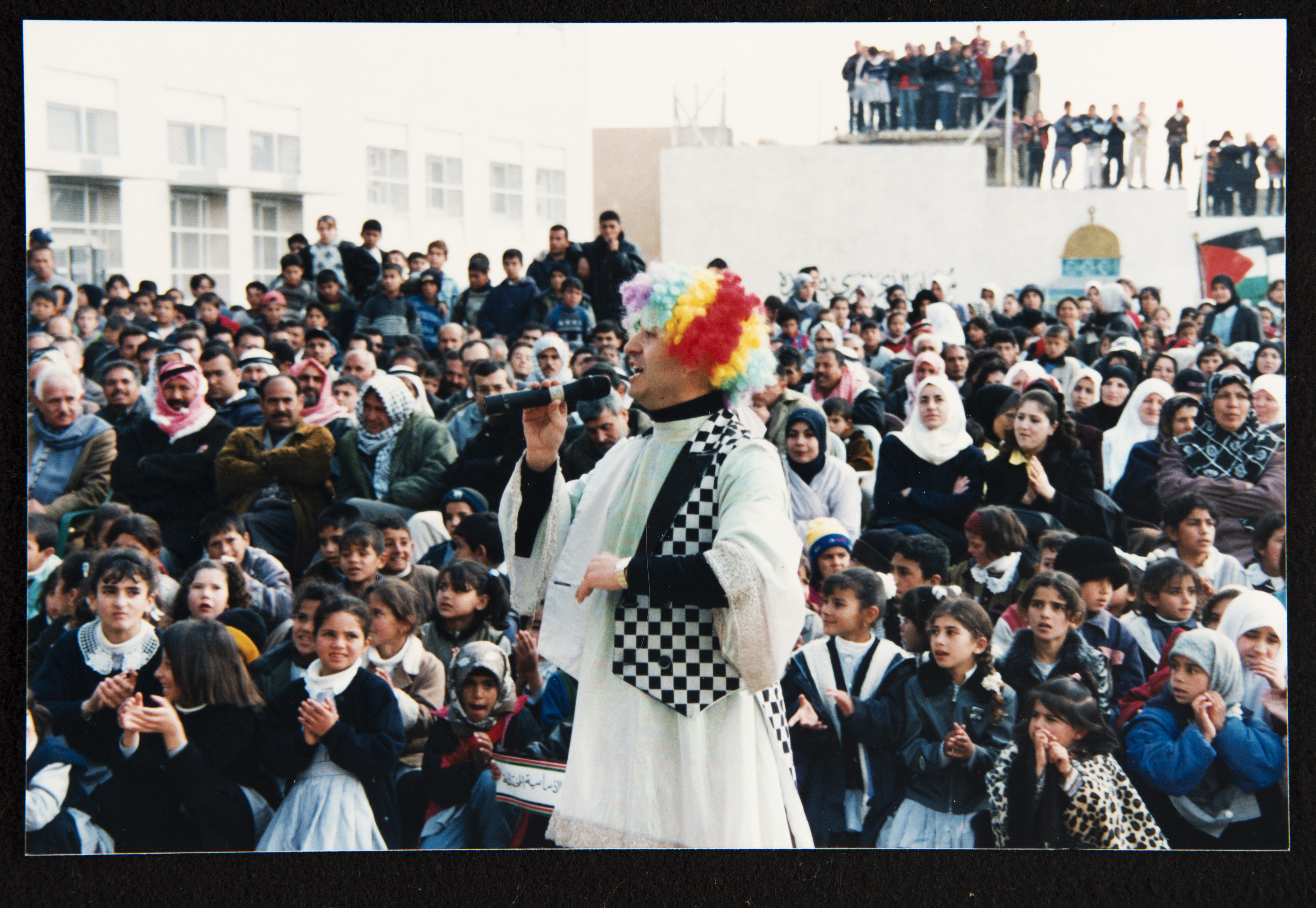 صورة ملونة من عرض مسرحية كراكوزي، من إنتاج مسرح عناد، أمام عدد كبير من طلبة مدارس بلدة سعير في محافظة الخليل.