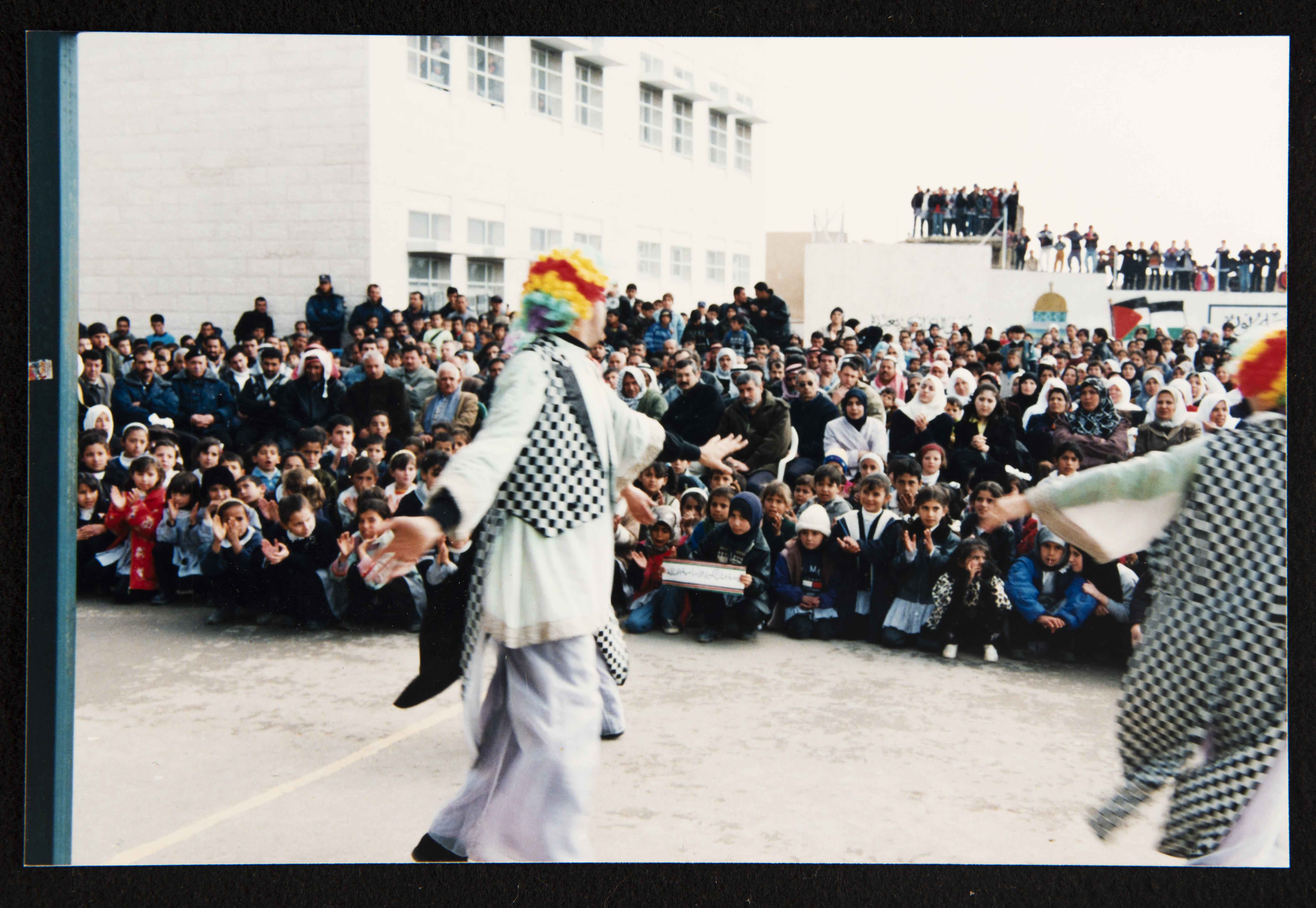 صورة ملونة من عرض مسرحية كراكوزي، من إنتاج مسرح عناد، أمام عدد كبير من طلبة مدارس بلدة سعير في محافظة الخليل.