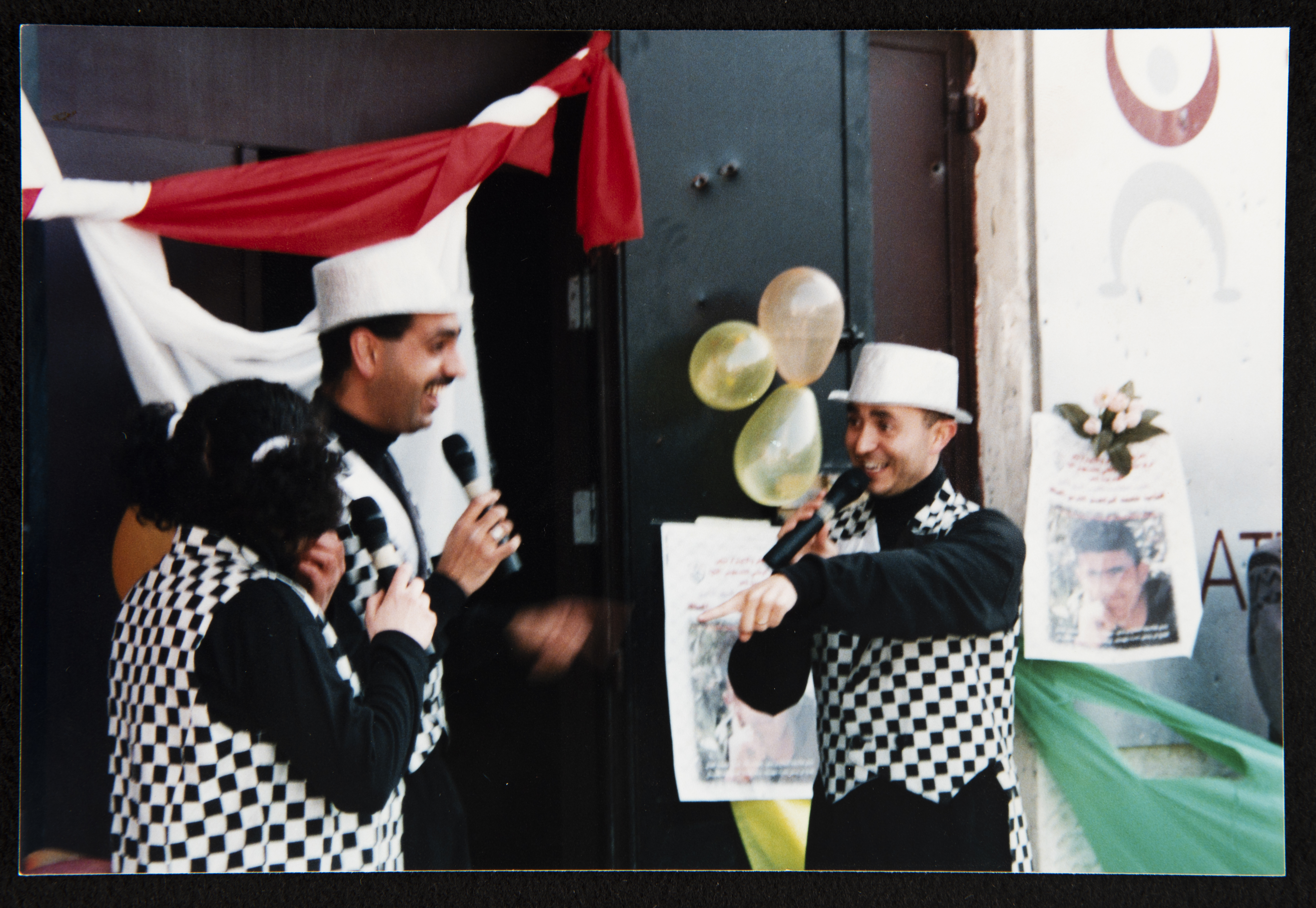 صورة ملونة من عرض مسرحية كراكوزي، امام مسرح عناد، بعد أن قصفته طائرات الاحتلال الاسرائيلي للمرة الأولى.