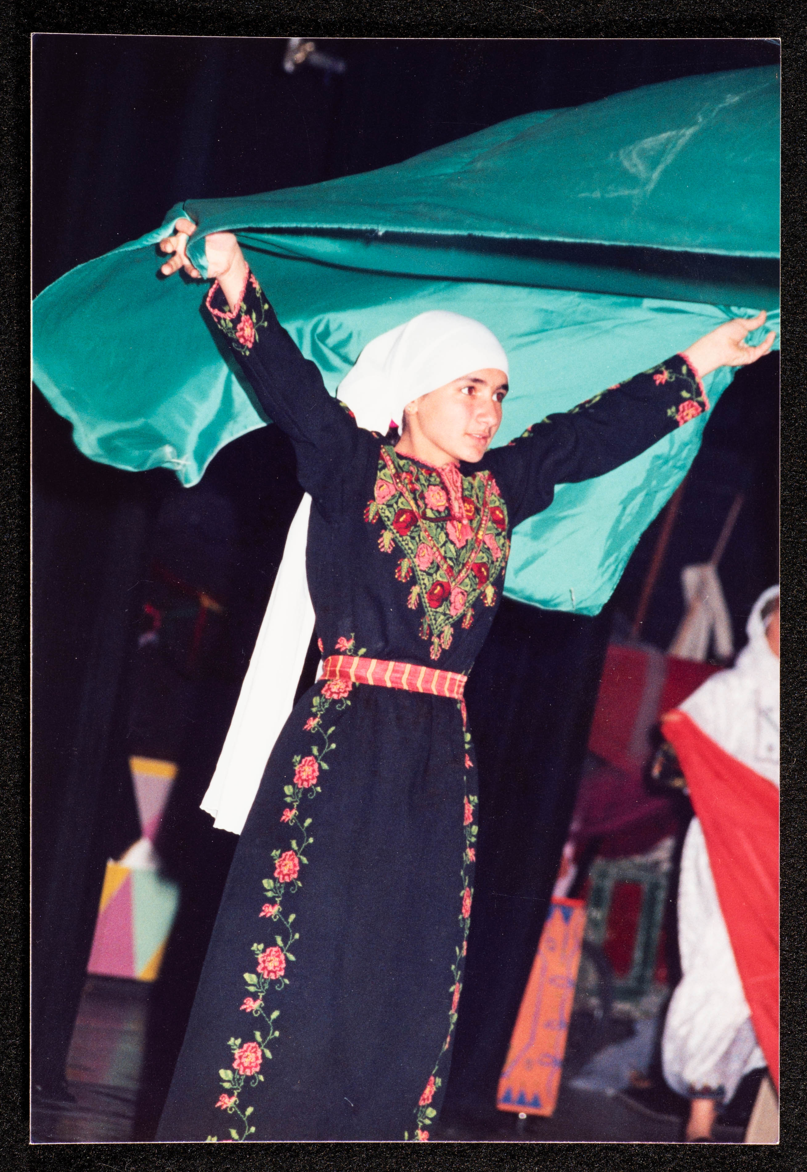 A colour photograph of a performance by al-Hannouneh Troupe.