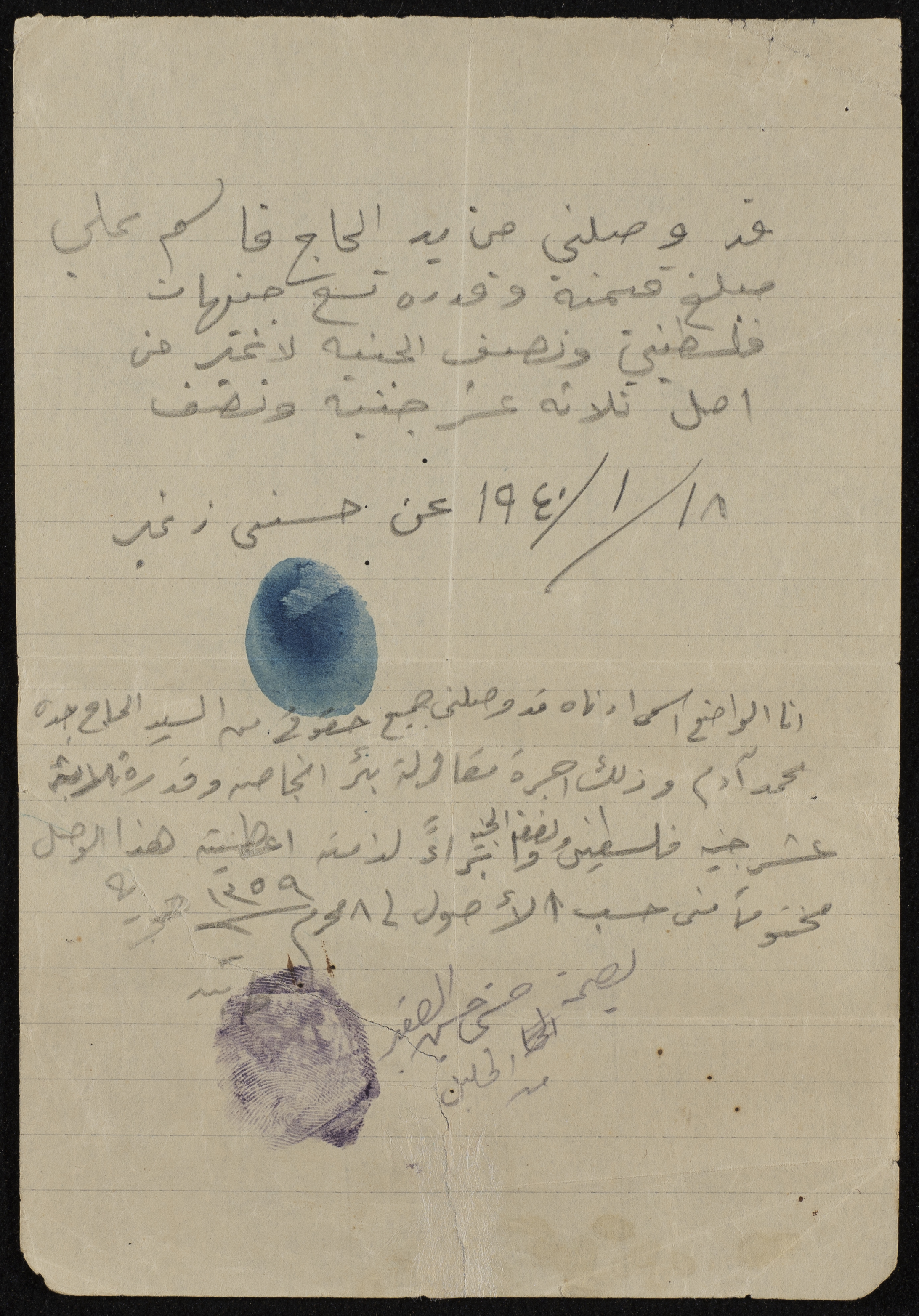 This document shows a financial document containing two financial receipts, the first stating that Hajj Qasim Ali had paid a sum of money to Husni Husein Zghayyer on 18 January 1940, while the second stating that Hajj Jadda Mohammad Adam had paid a sum of money in exchange for a water-well contract to Husni Hussein as-Saqr on 17 February 1940.