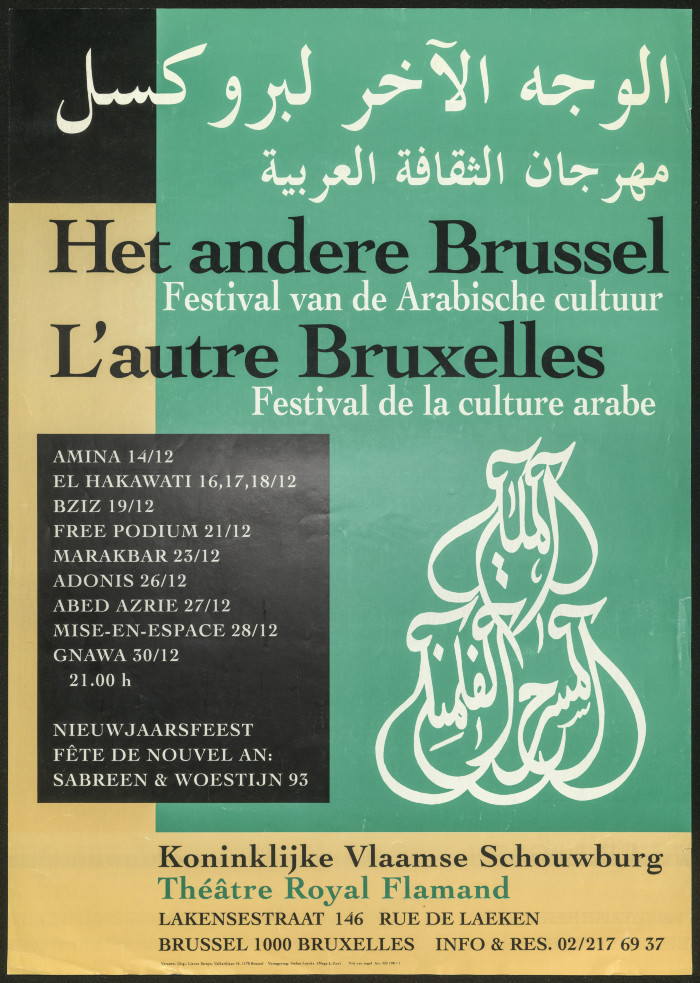 Entitled "The Other Face of Brussels", this poster by the Arab Culture Festival features activities including poems by Palestinian poet Mahmud Darwish, performances by Palestinian groups, namely, Sabrin Group from Jerusalem, and el-Hakawati Theatre led by François abu Salem and ʿĀmer Khalil.